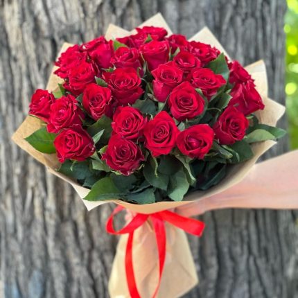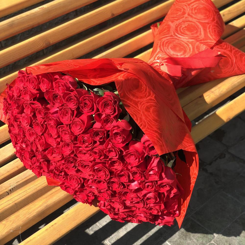 Большой, объемный букет из 101 метровой Розы, стильно упакованный в мешковину. Действительно, шикарный подарок для самой любимой!
