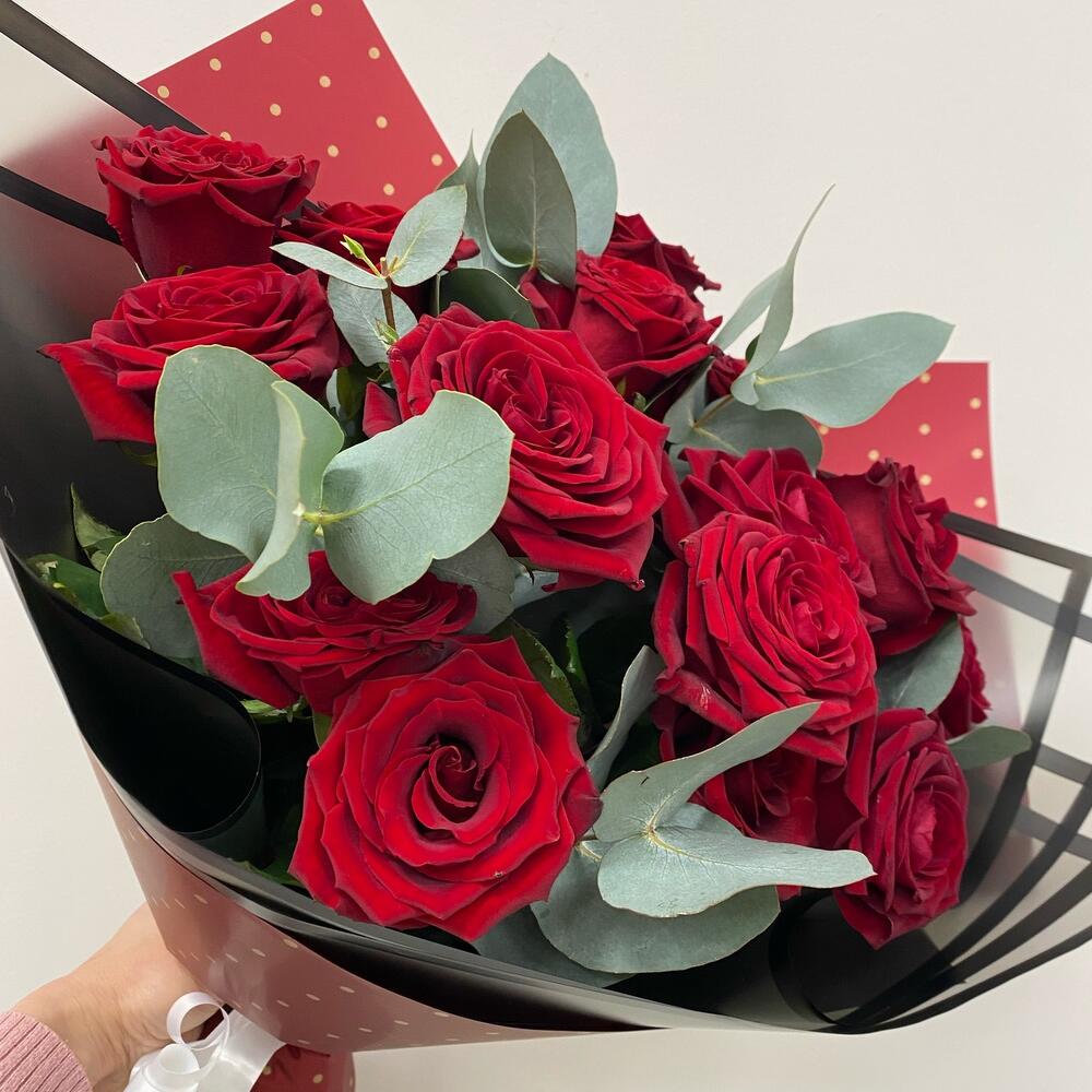 роза ред наоми. – 15 шт.Эвкалипт – 2 шт.Упаковка дизайнерская – 2 шт.Лента – 1 шт.