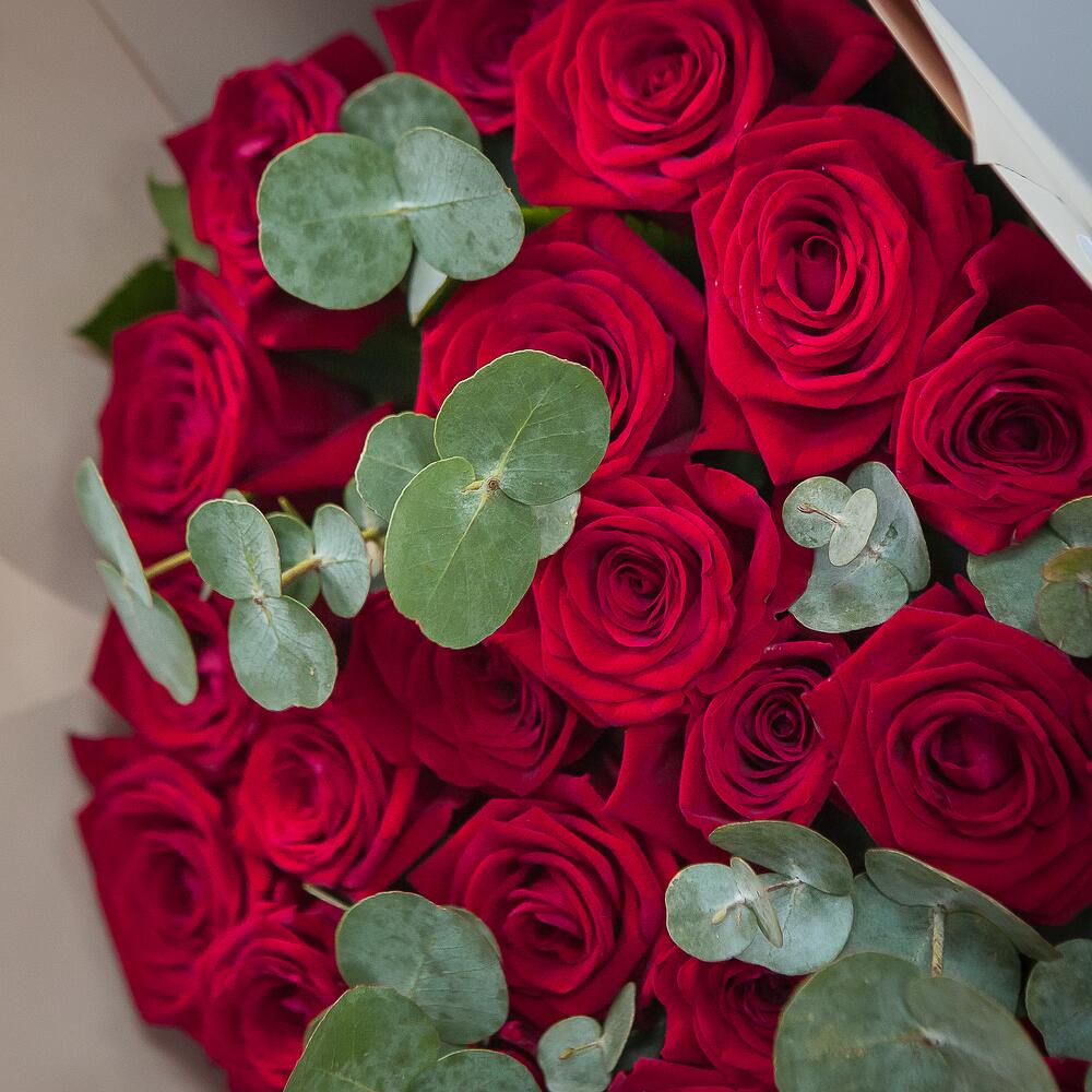 Букет из 25 красных роз с эвкалиптом