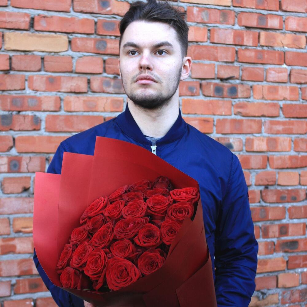 Роза красная – 25 шт.Лента атласная – 1 шт.упаковочный материал – 2 шт.