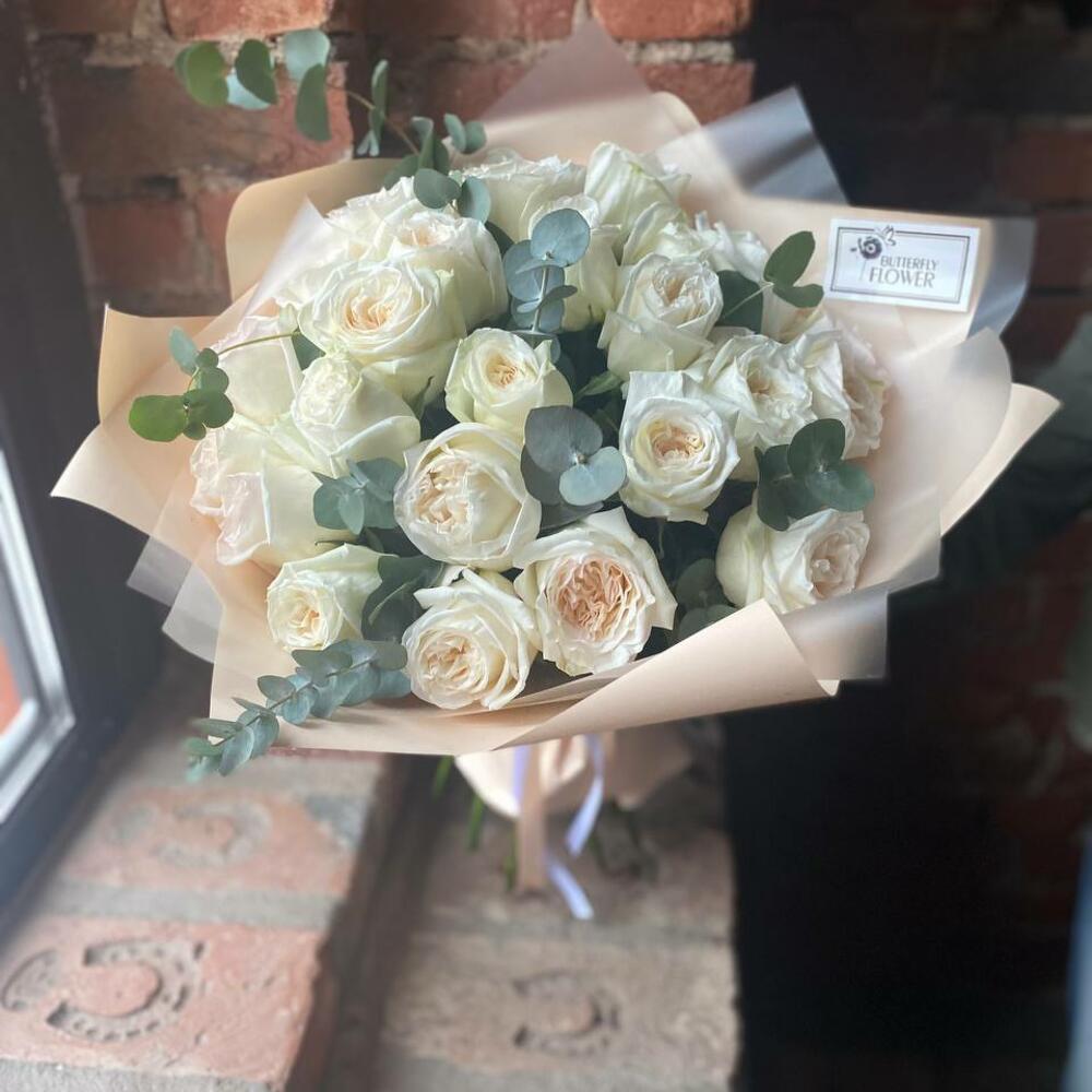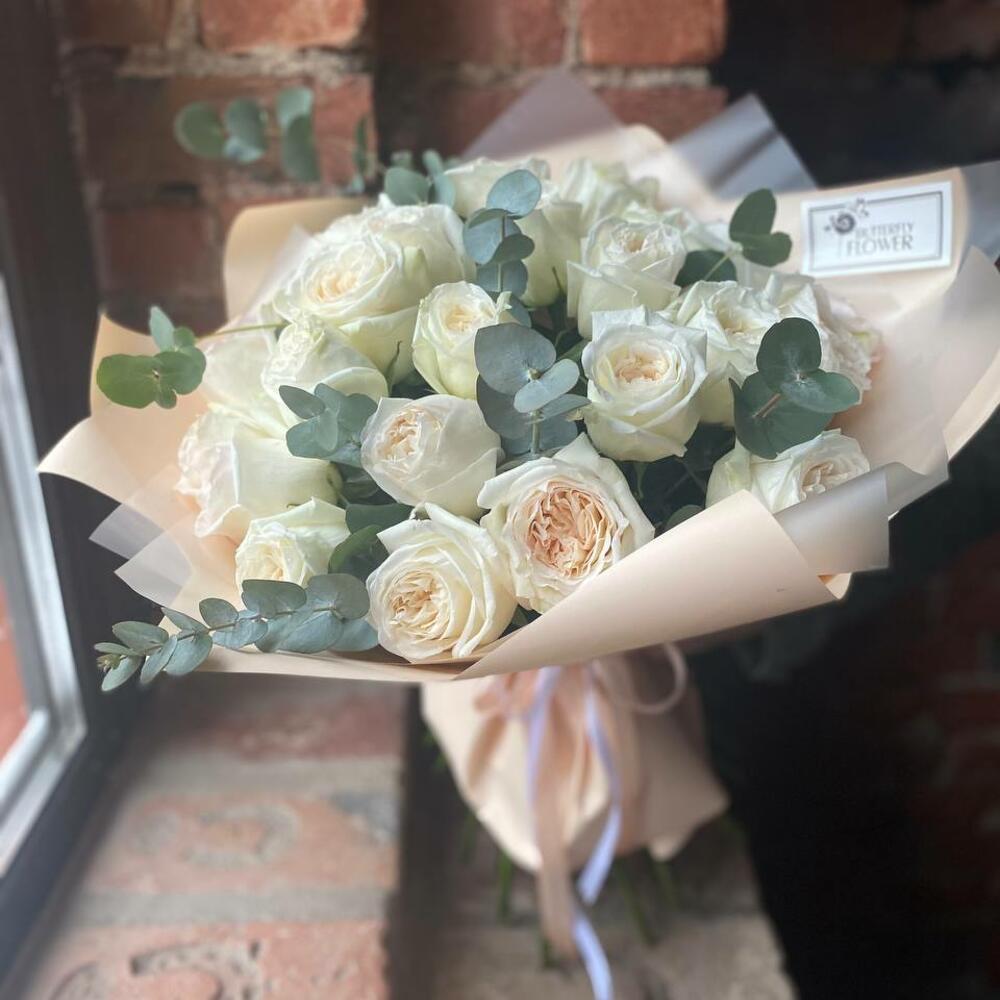 Роза пионовидная – 25 шт.Эвкалипт – 5 шт.Упаковка – 2 шт.Лента – 2 шт.