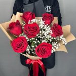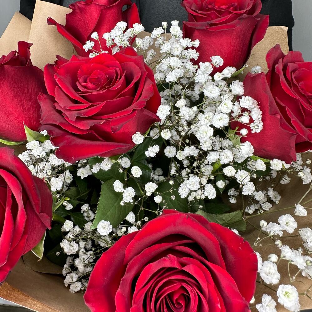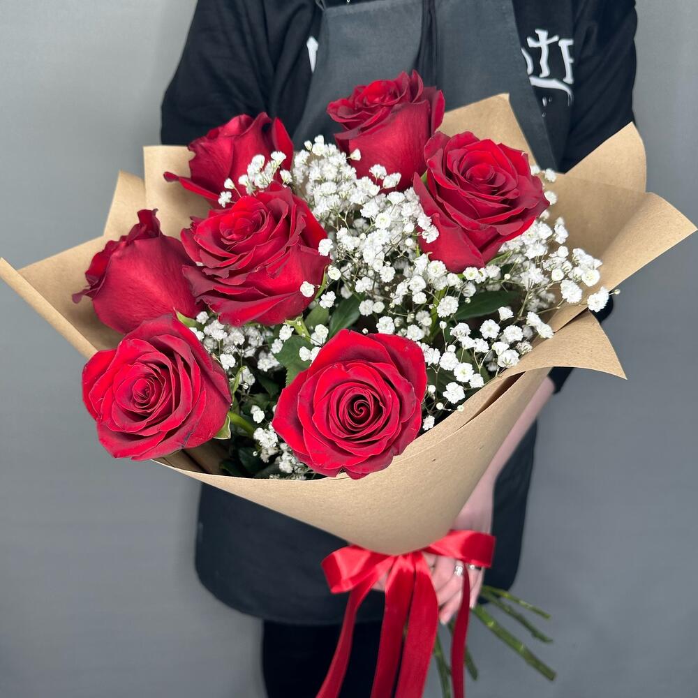 Букет из 7 красных роз и белой гипсофилы “Классика”