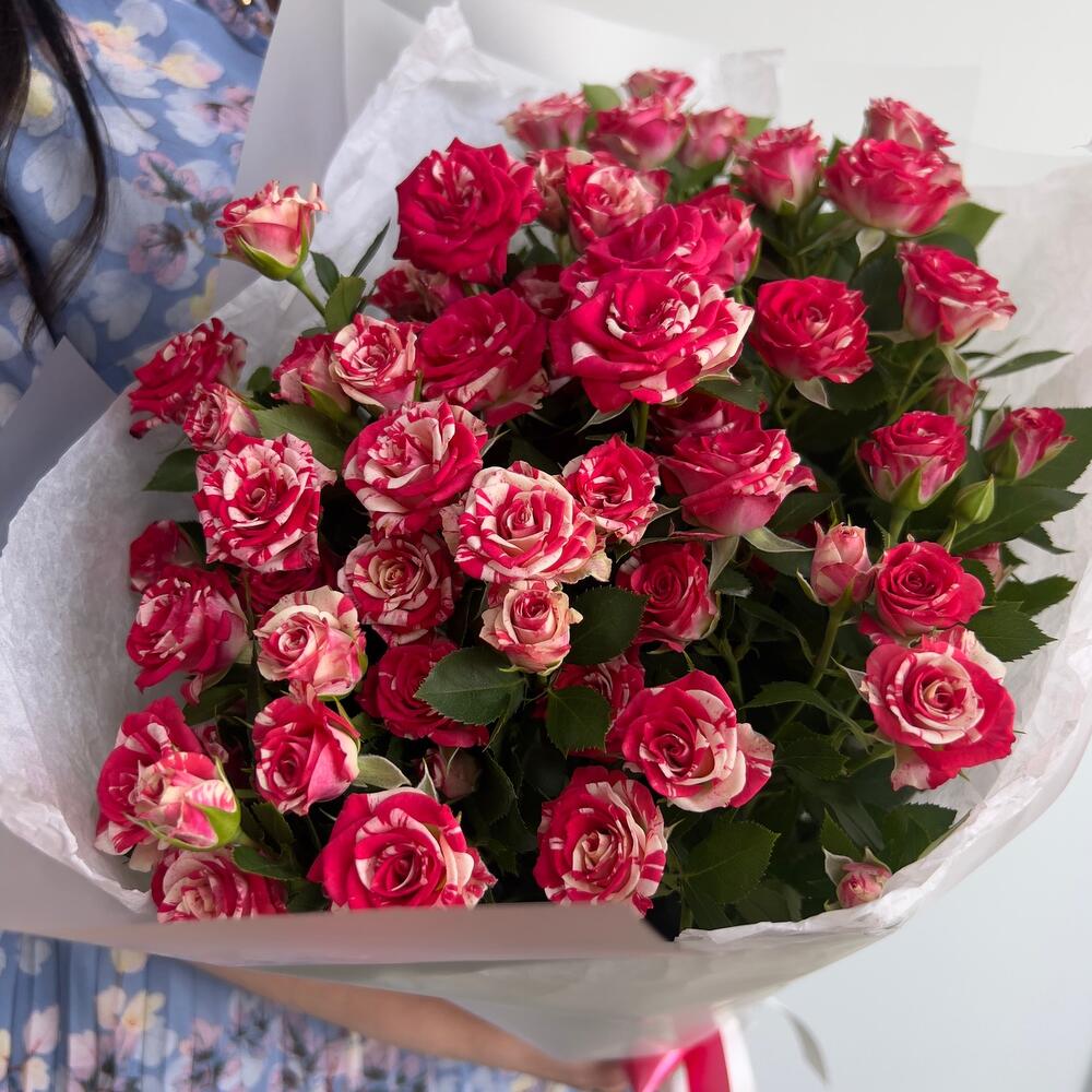 Кустовая роза – 7 шт.Пленка матовая – 2 шт.Тишью белое – 2 шт.Лента атласная – 1 шт.