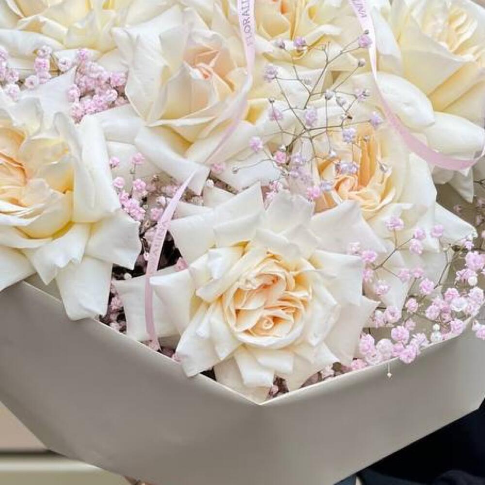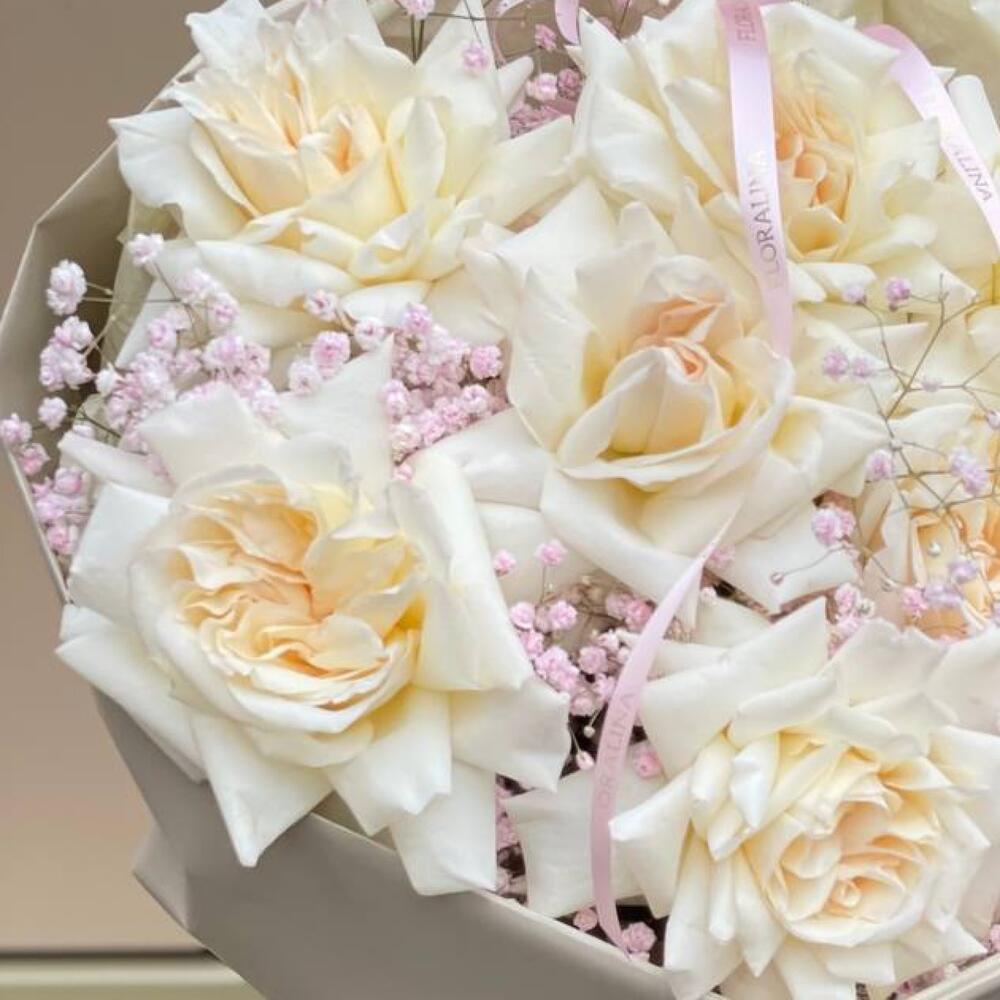 Лента атласная – 1 шт.Тишью – 2 шт.Упаковка дизайнерская – 1 шт.лента фирменная – 1 шт.гипсофила розовая голландская – 4 шт.роза пионовидная white o’hara – 7 шт.