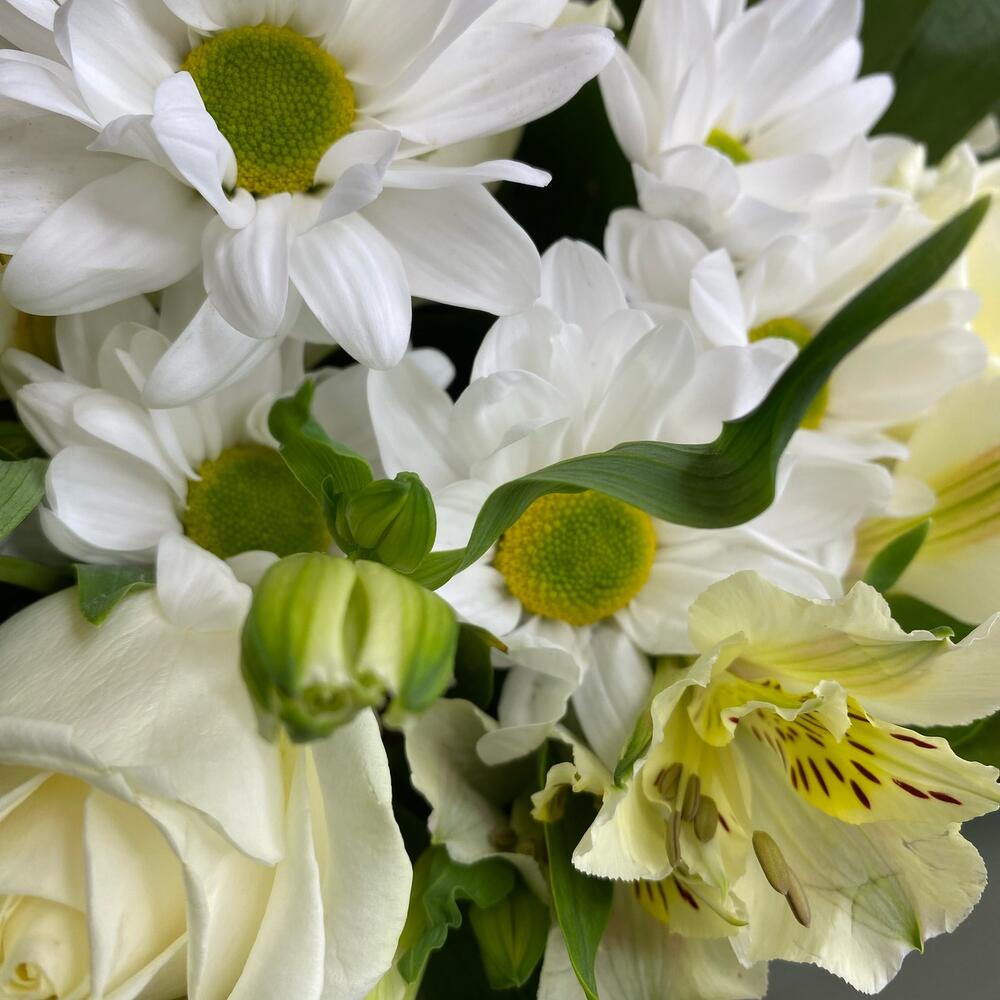 Букет из белых альстромерий, роз и хризантем
