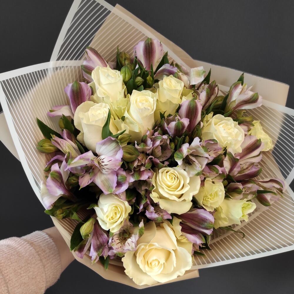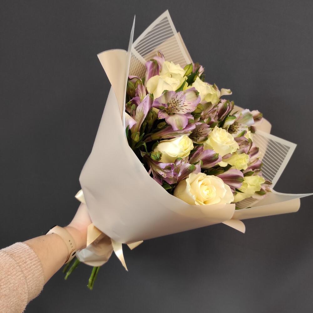 Роза – 11 шт.Альстромерия – 8 шт.Пленка матовая – 3 шт.Лента атласная – 1 шт.