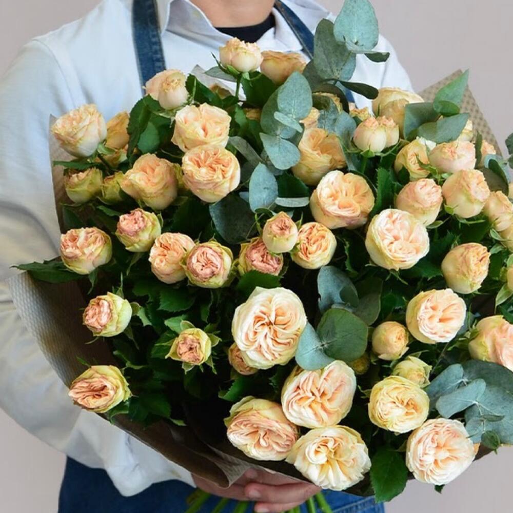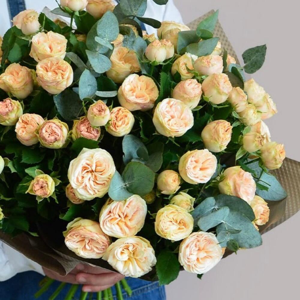 Большой Букет из кустовых пионовидных роз с эвкалиптом