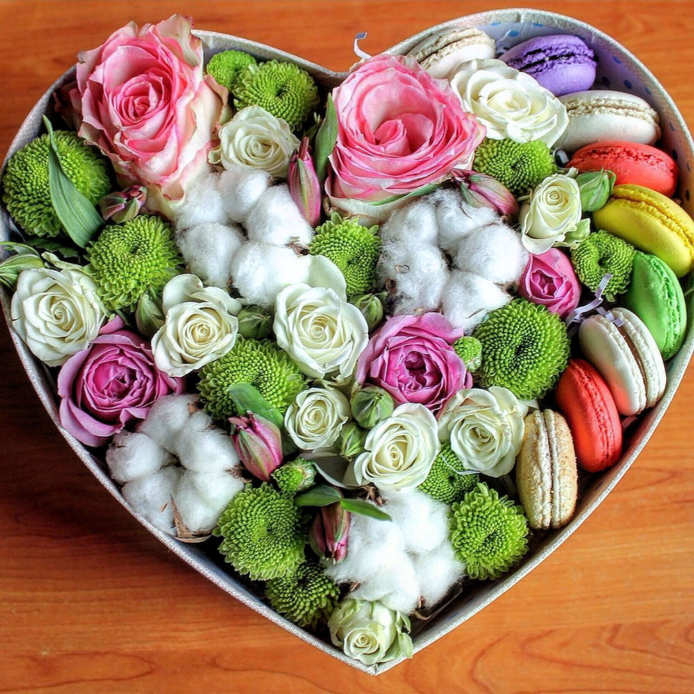 Альстромерия – 1 шт.Роза кустовая – 3 шт.Хлопок – 4 шт.Хризантема кустовая – 4 шт.Роза – 3 шт.Коробка-сердце – 1 шт.Макарон – 8 шт.