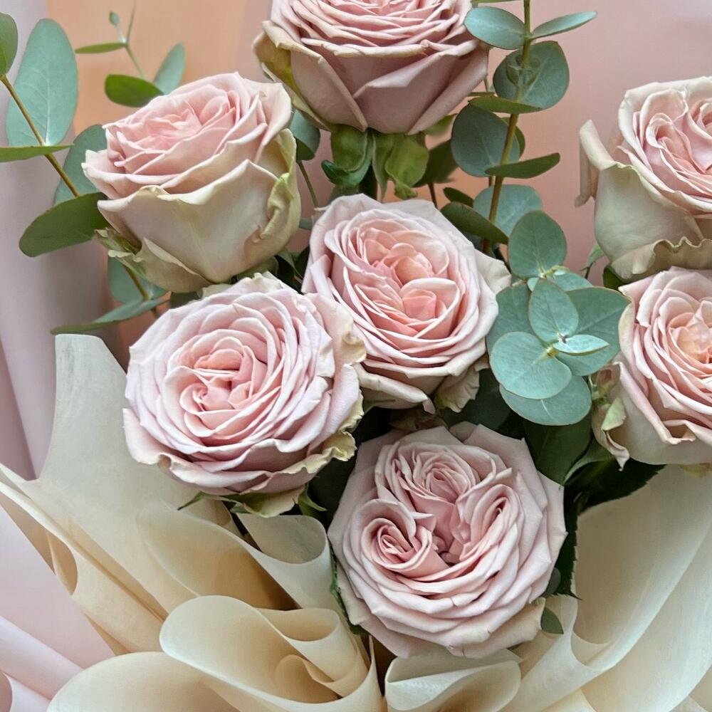 Одноголовая роза – 7 шт.Эвкалипт – 4 шт.декоративная упаковка – 1 шт.Атласная лента – 1 шт.
