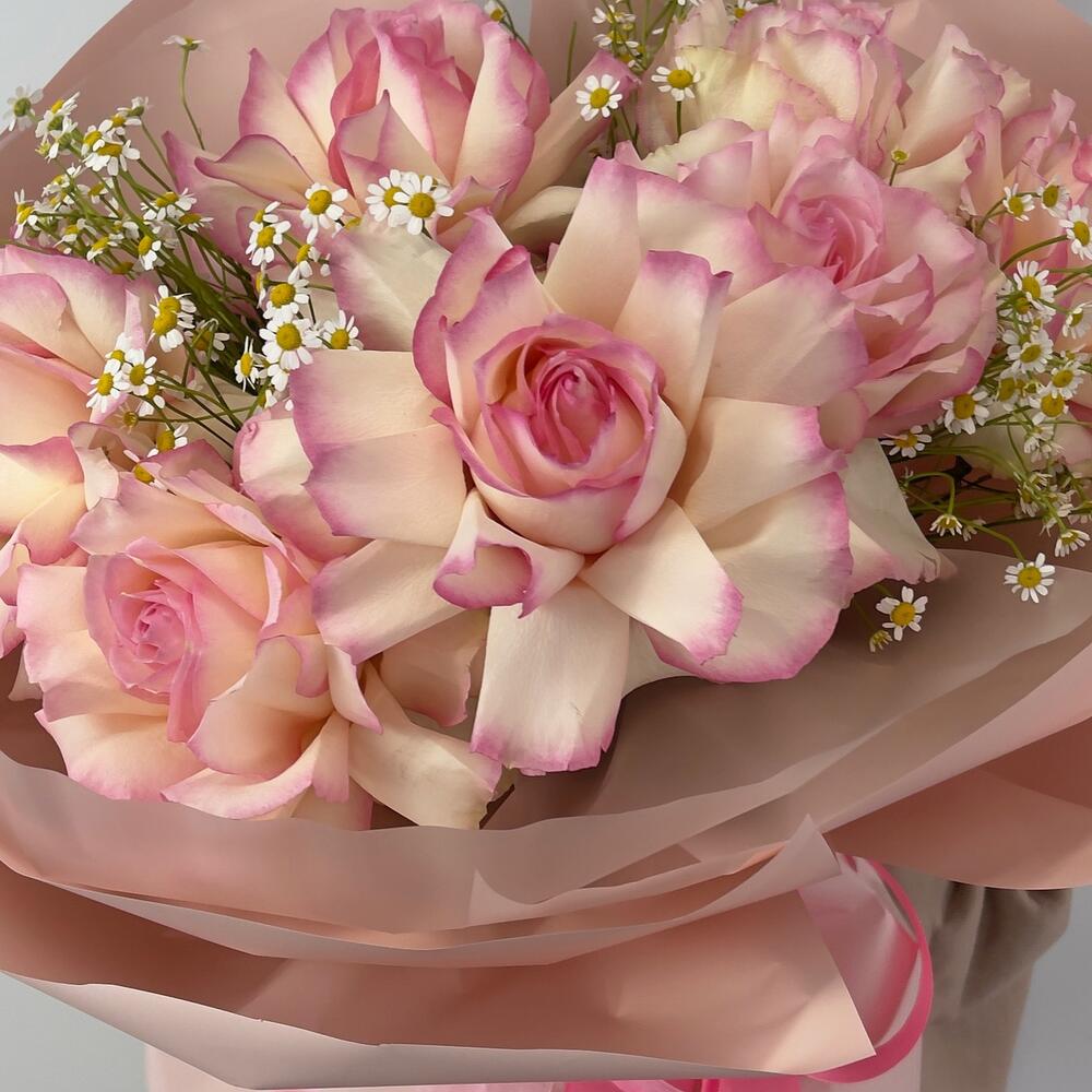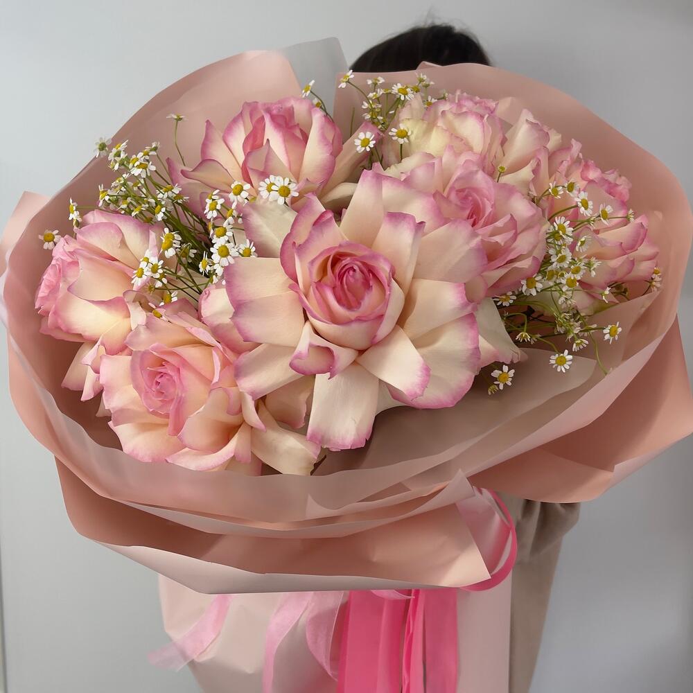 Тишью – 4 шт.Ромашка кустовая – 5 шт.Фисташка – 7 шт.Роза французская – 7 шт.Пленка матовая – 4 шт.