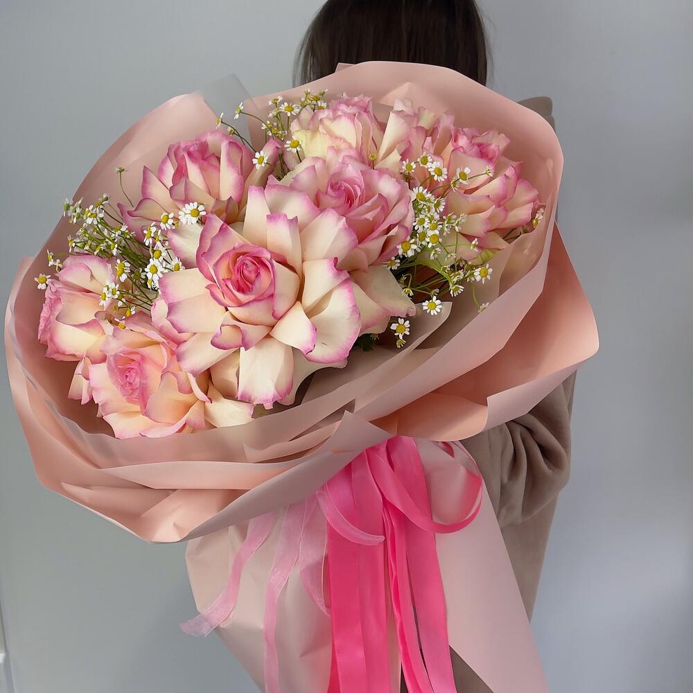 Букет из французских роз ,ромашек в дизайнерском оформлении
