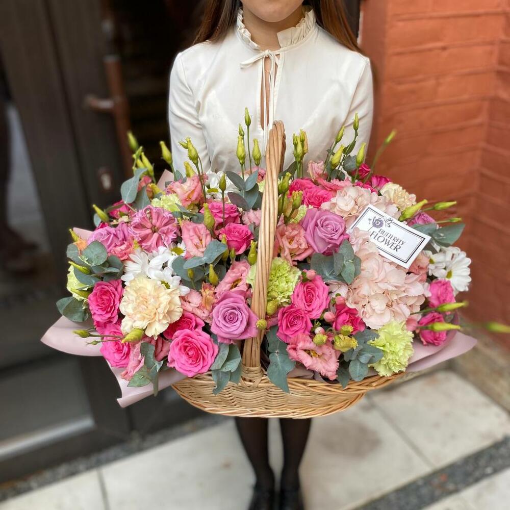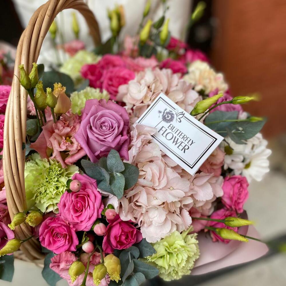Букет из гортензии, гвоздик, гиперикума, эустомы, роз, эвкалипта и фисташки в плетеной корзине “Ариадна”
