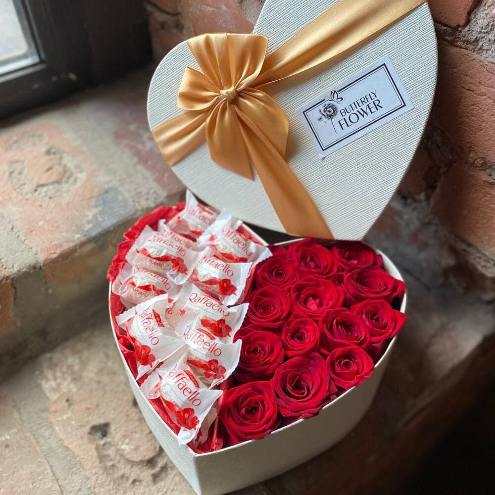Букет из красных роз и рафаэлло в декоративной коробке-сердце “Джаггер”
