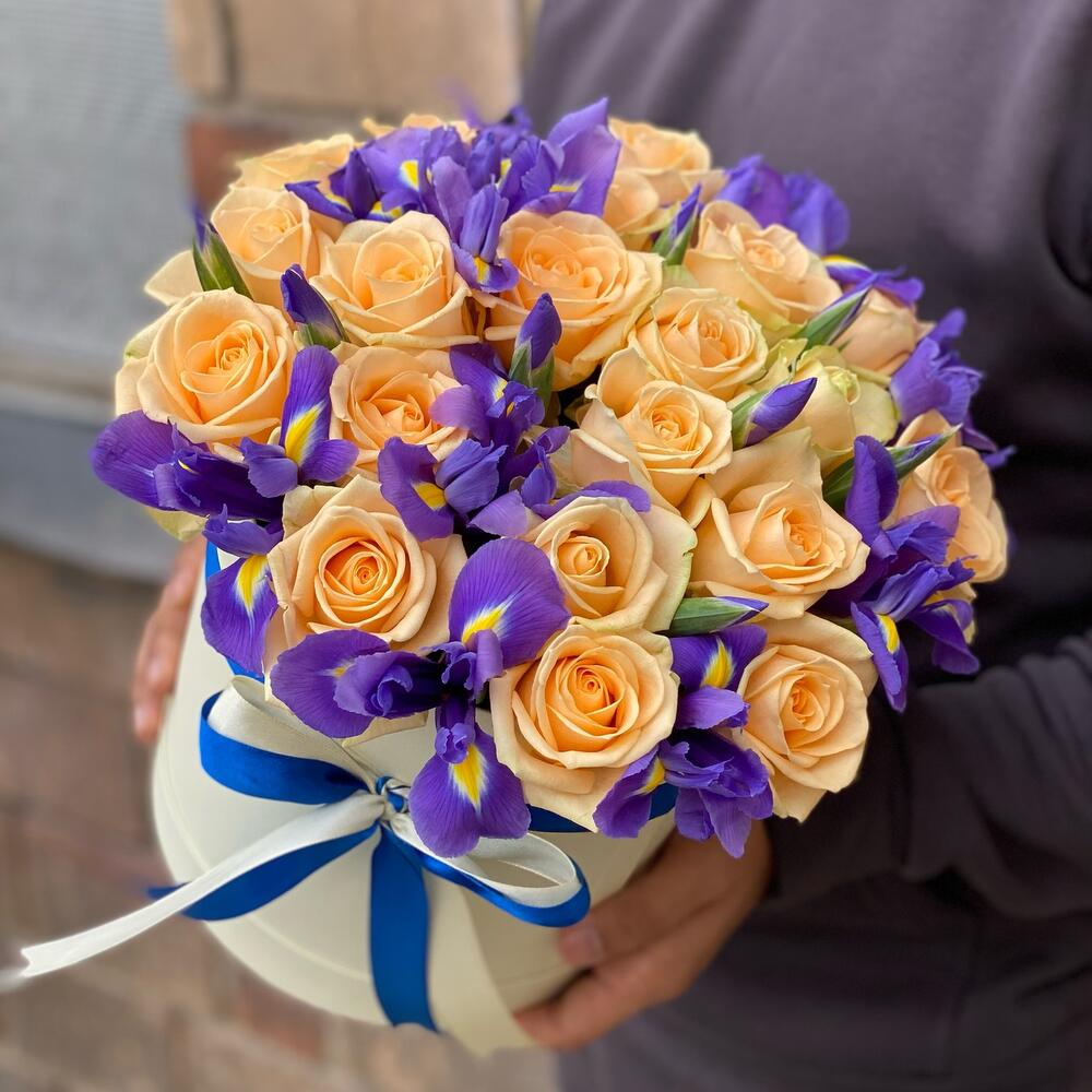 Ирис – 19 шт.Лента атласная – 2 шт.Коробка шляпная – 1 шт.Оазис флористический – 1 шт.Роза кремовая 50 см – 20 шт.