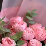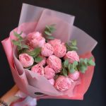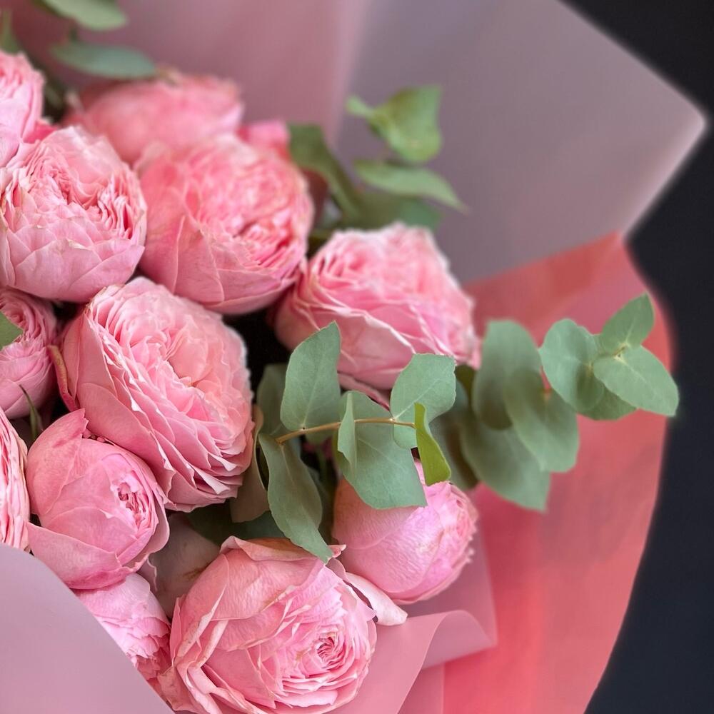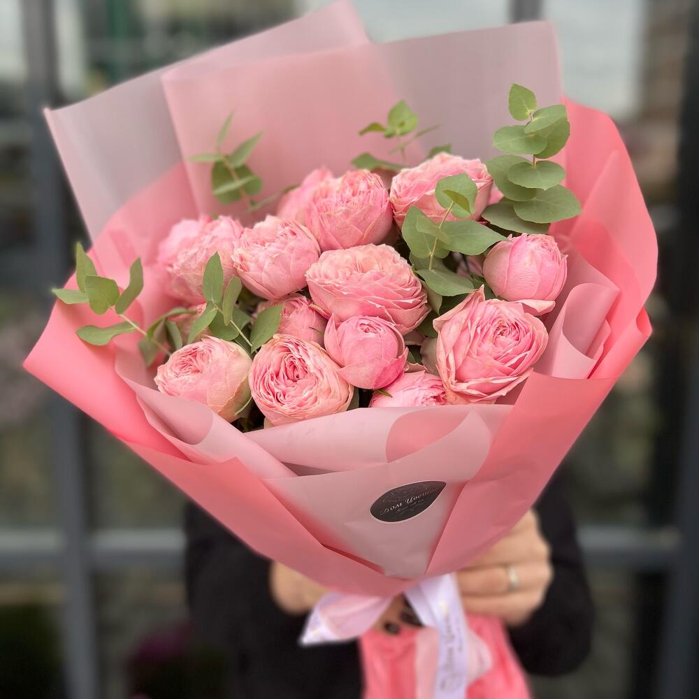 Кустовая пионовидная роза – 5 шт.Эвкалипт – 3 шт.декоративная упаковка – 1 шт.Атласная лента – 1 шт.