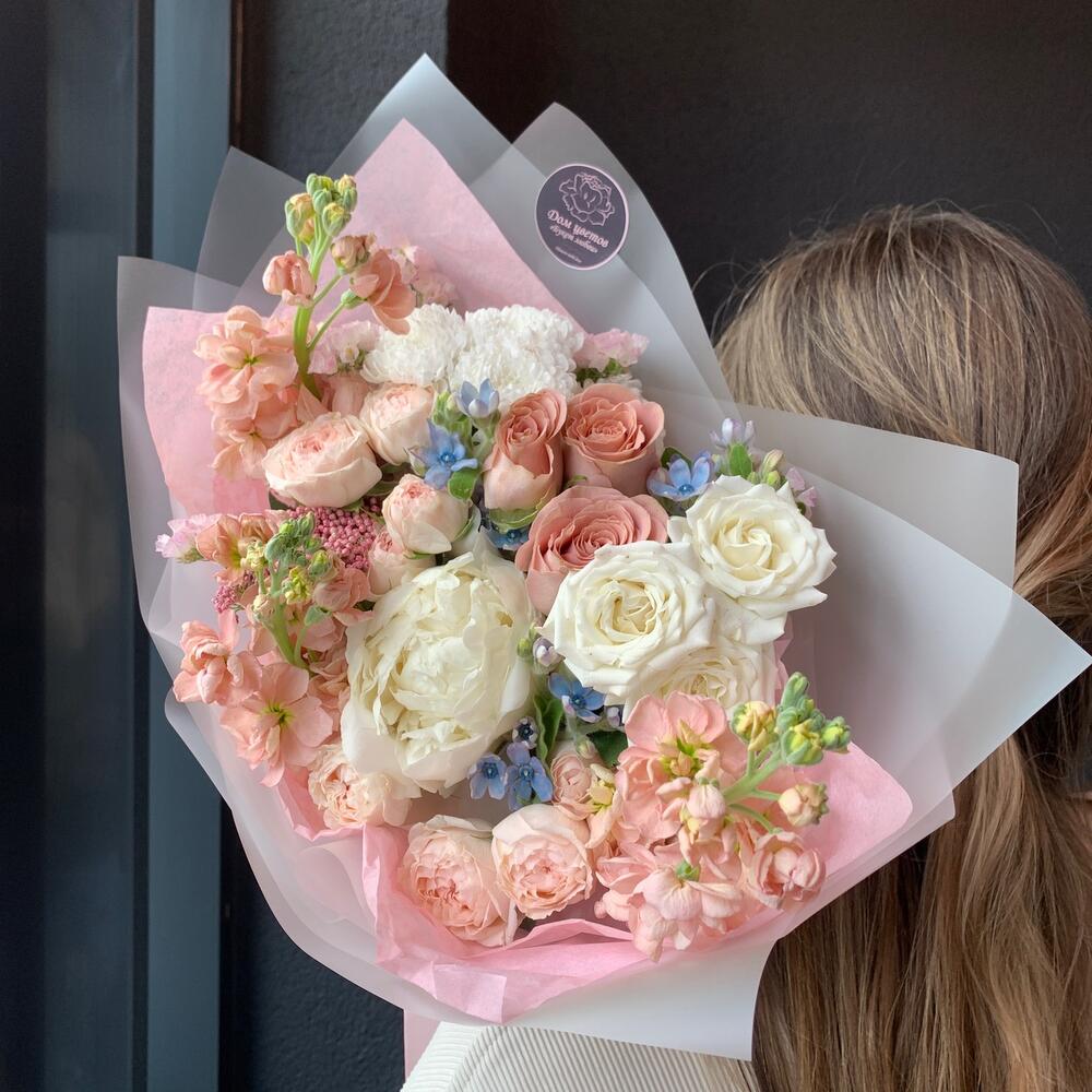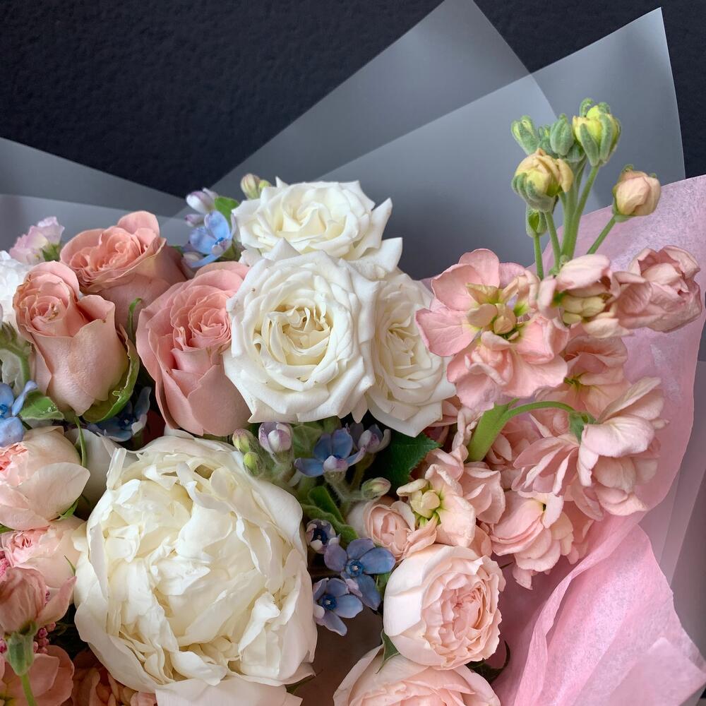 Букет из кустовой пионовидной розы, пиона и маттиолы «Радость»