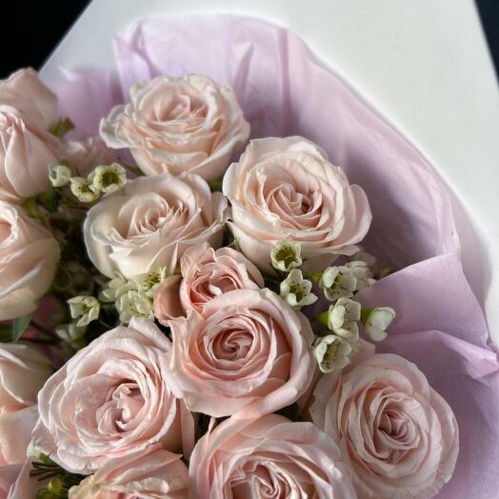Роза кустовая пионовидная – 5 шт.хаменлациум – 1 шт.Дизайнерская упаковка – 1 шт.Атласная лента – 1 шт.
