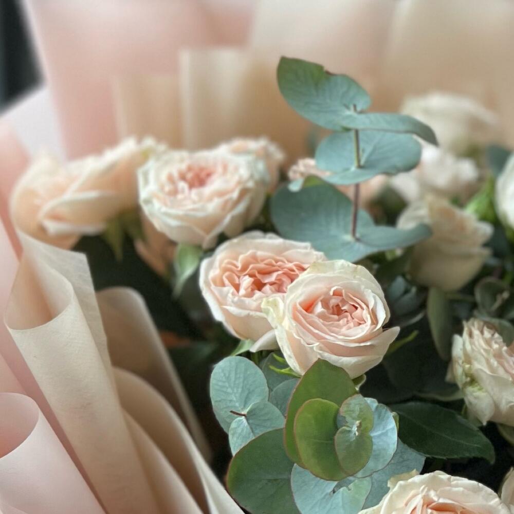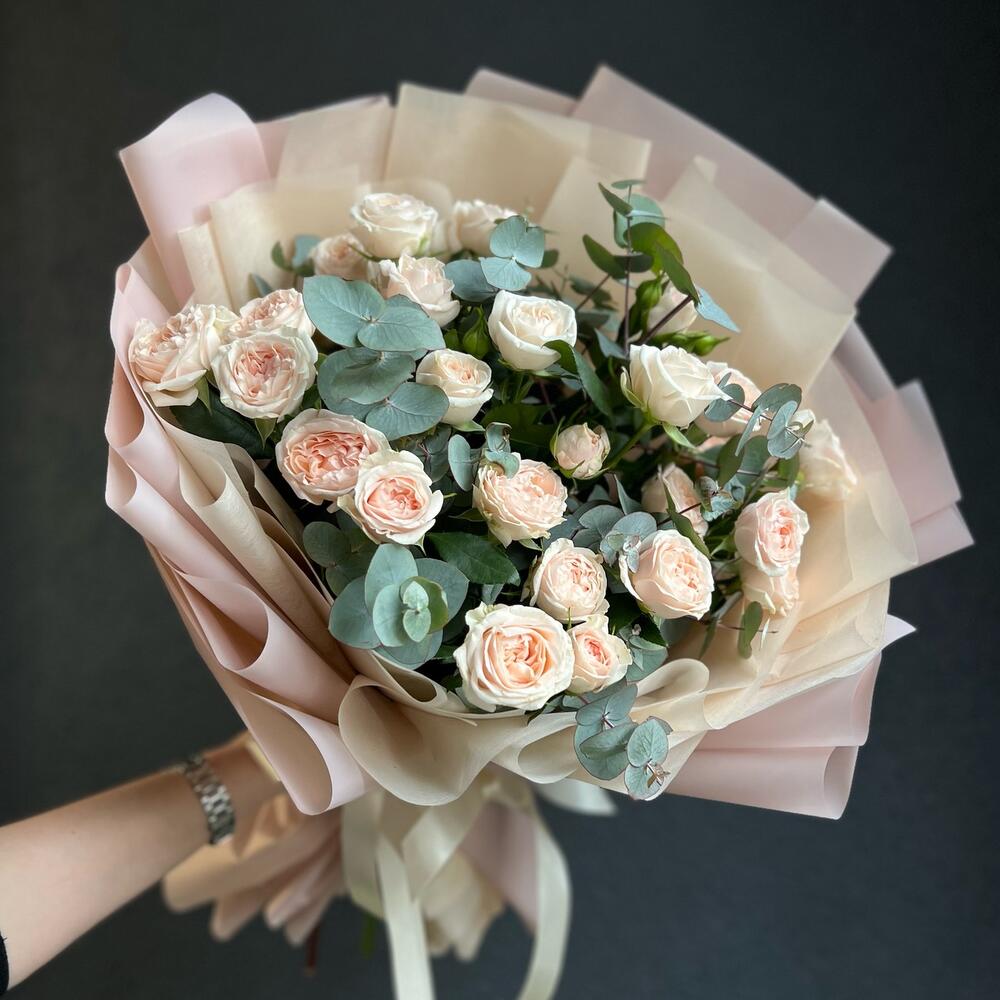 Эвкалипт – 3 шт.Кустовая роза – 5 шт.Атласная лента – 1 шт.декоративная упаковка – 3 шт.