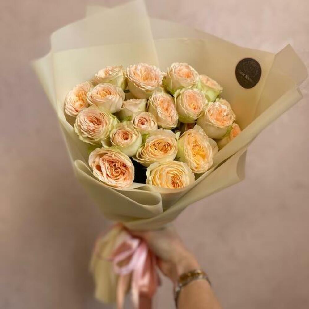 Кустовая пионовидная роза – 5 шт.Дизайнерская упаковка – 1 шт.Атласная лента – 1 шт.