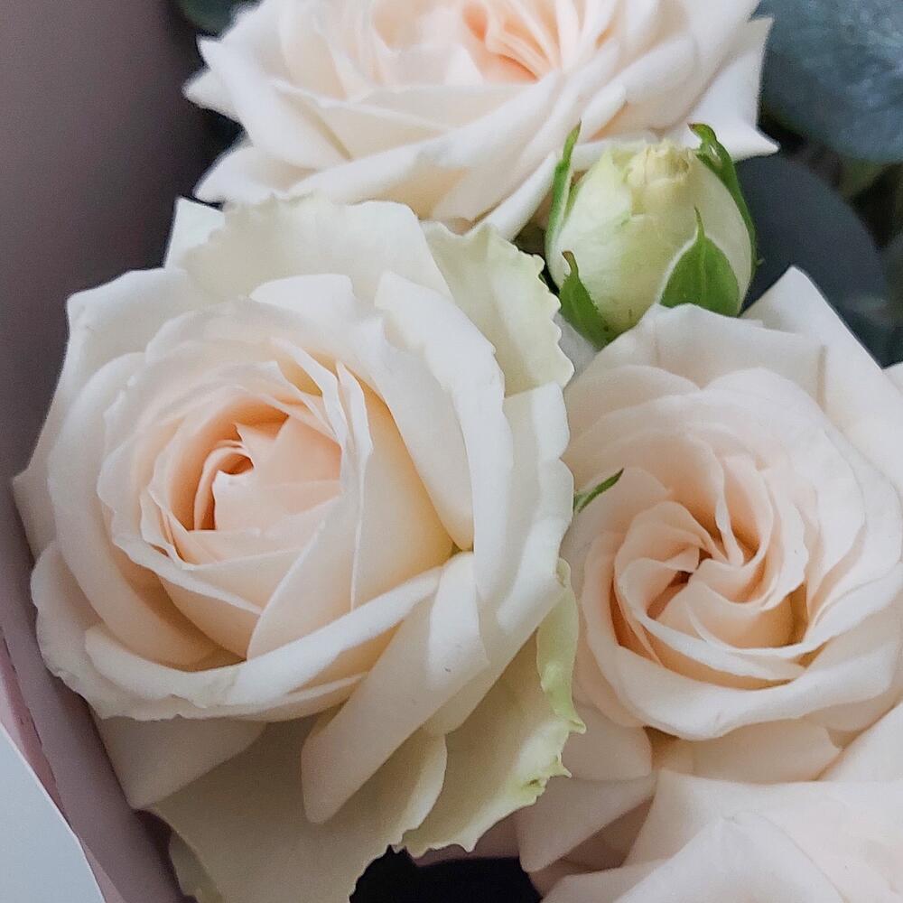 Роза кустовая – 9 шт.Упаковка дизайнерская – 2 шт.Лента органза – 1 шт.Открыточка с вашими пожеланиями – 1 шт.Эвкалипт Baby Blue – 3 шт.