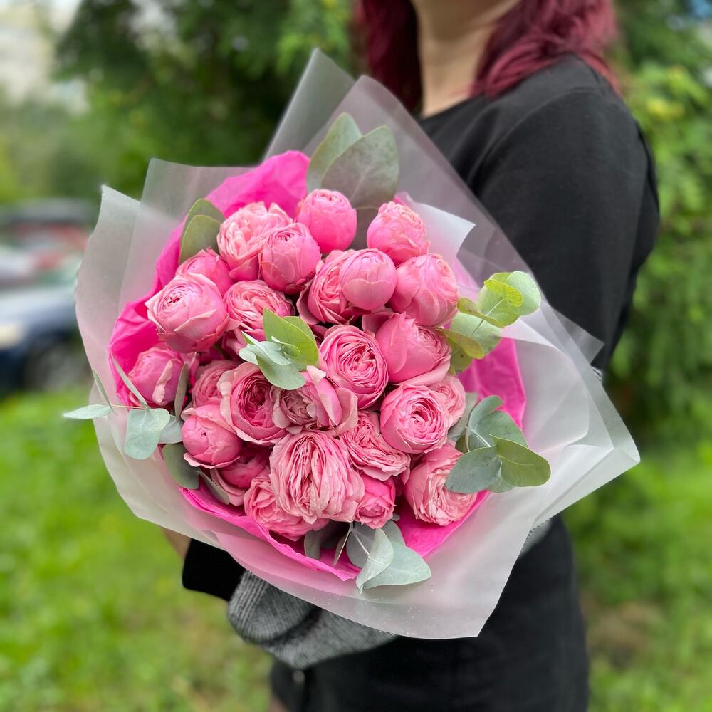 Роза пионовидная – 7 шт.эвкклипт – 3 шт.Тишью – 2 шт.Пленка матовая – 2 шт.