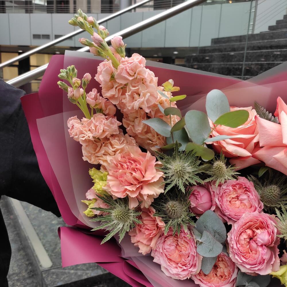 кахала роза – 2 шт.маттиола персиковая – 2 шт.джульетта роза пионовидная – 1 шт.Диантус – 3 шт.Эрингиум – 1 шт.Папоротник – 1 шт.Лагурус (сухоцвет) – 3 шт.Упаковка дизайнерская – 1 шт.