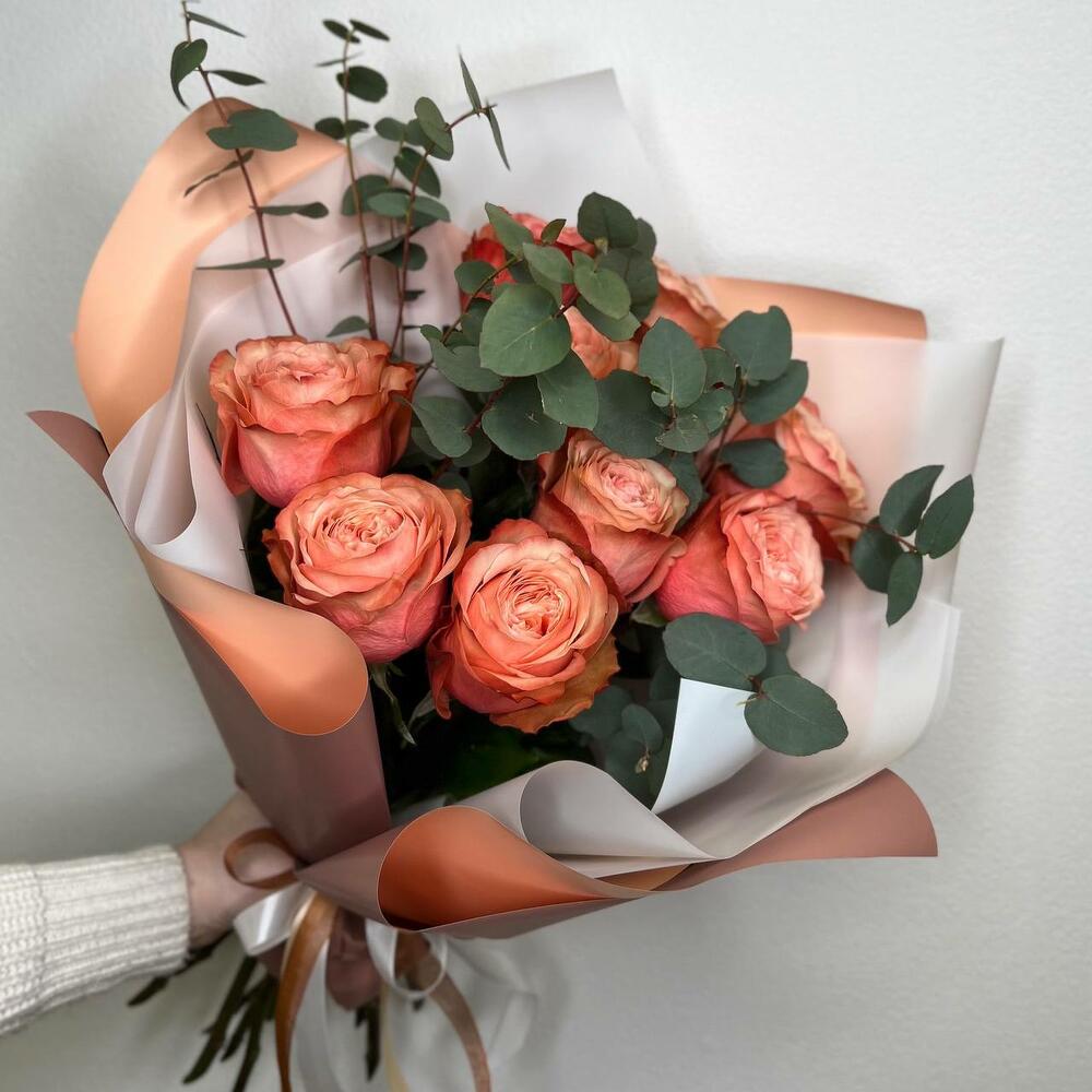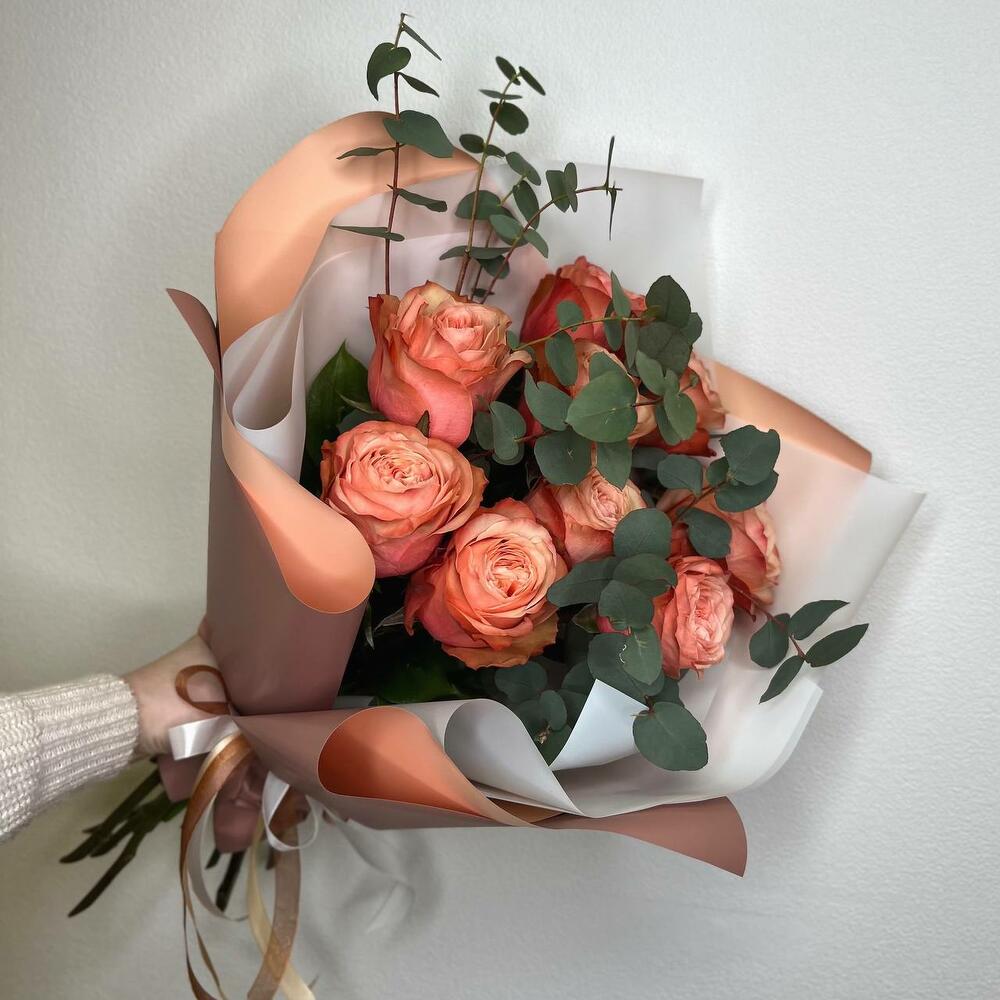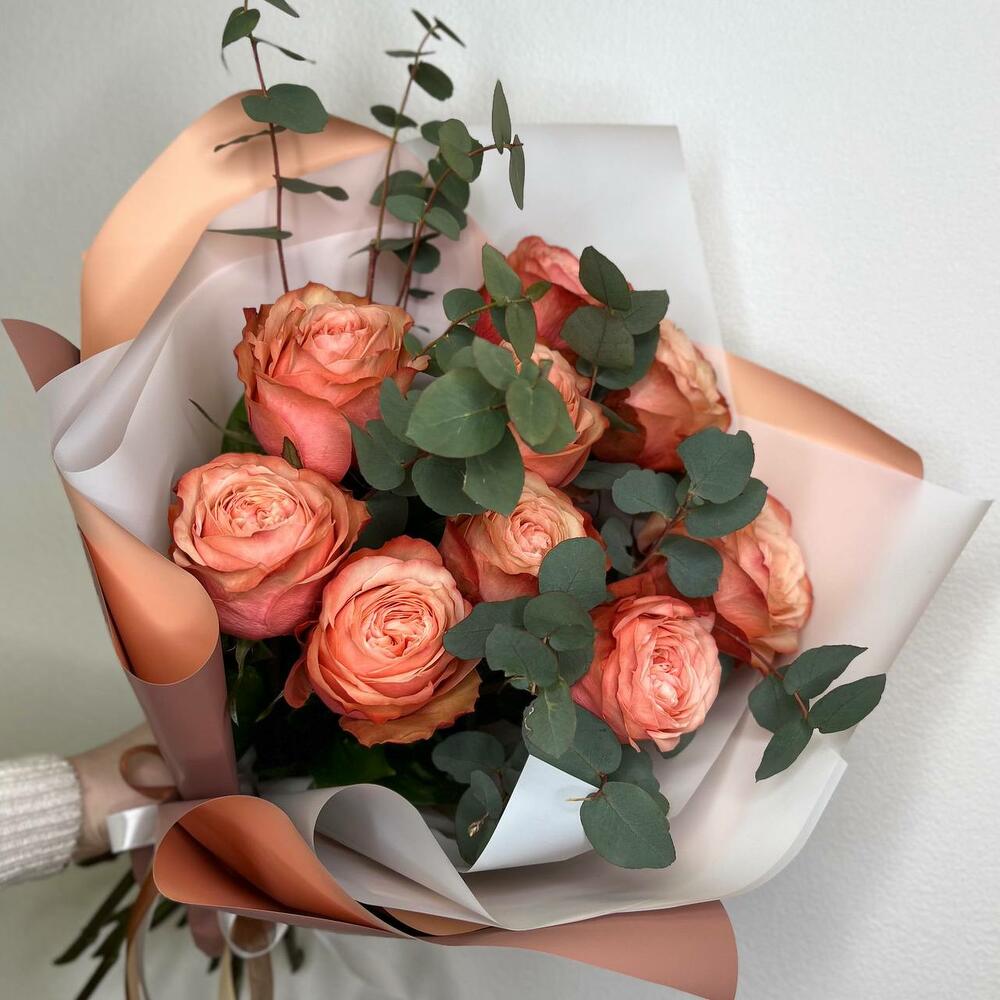 Букет из пионовидных персиковых роз и эвкалипта