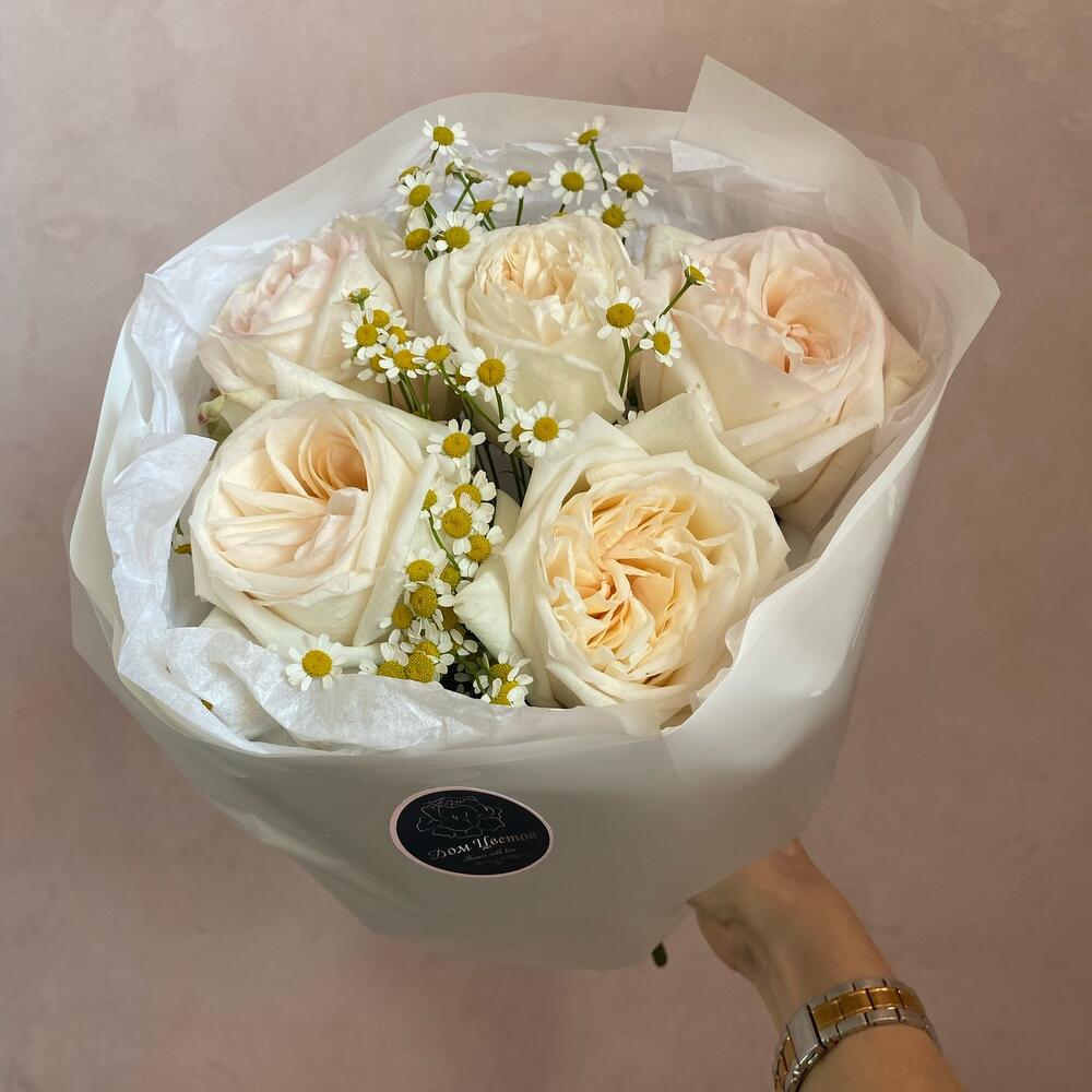 пионовидная роза white o’hara – 5 шт.Танацетум – 3 шт.декоративная упаковка – 1 шт.Атласная лента – 1 шт.