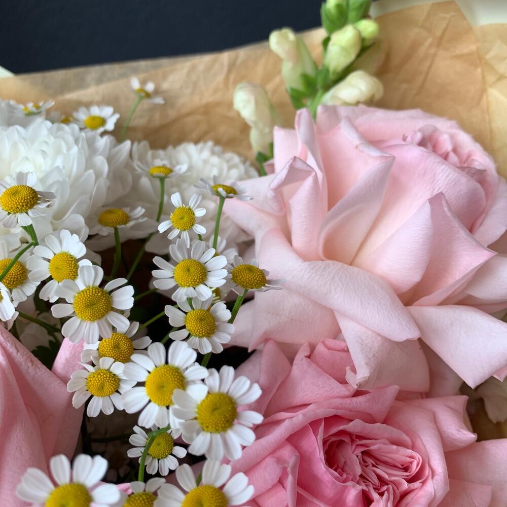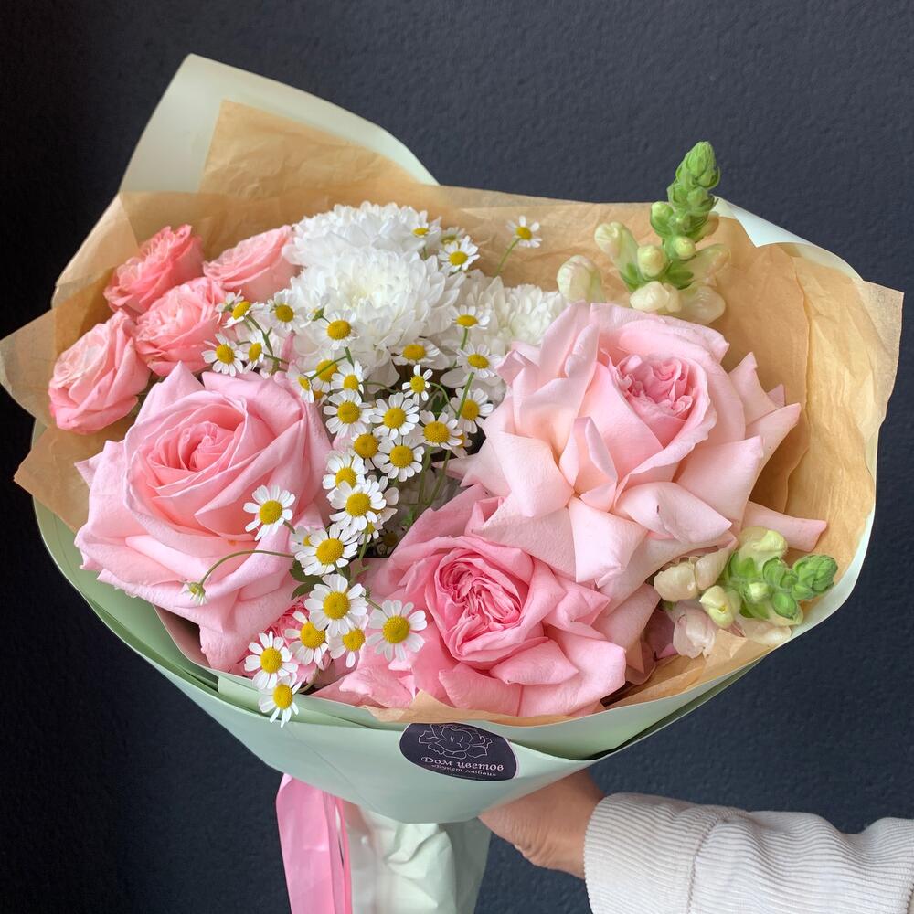 Букет из пионовидных роз, ромашки и антиринум «любовь»