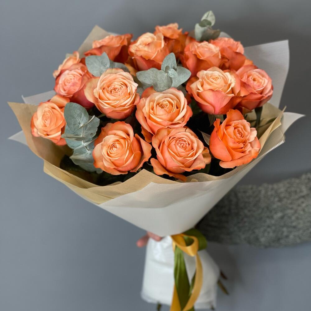 Лента – 1 шт.Эвкалипт – 3 шт.Роза одноголовая – 15 шт.Упаковка дизайнерская – 1 шт.