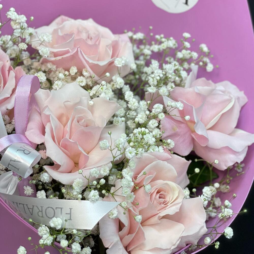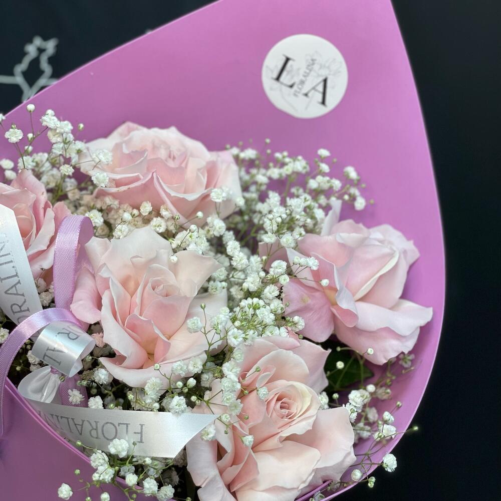 Гипсофила – 4 шт.Роза Эквадор 60 см – 5 шт.лента фирменная – 2 шт.Фоамиран (упаковка) – 1 шт.