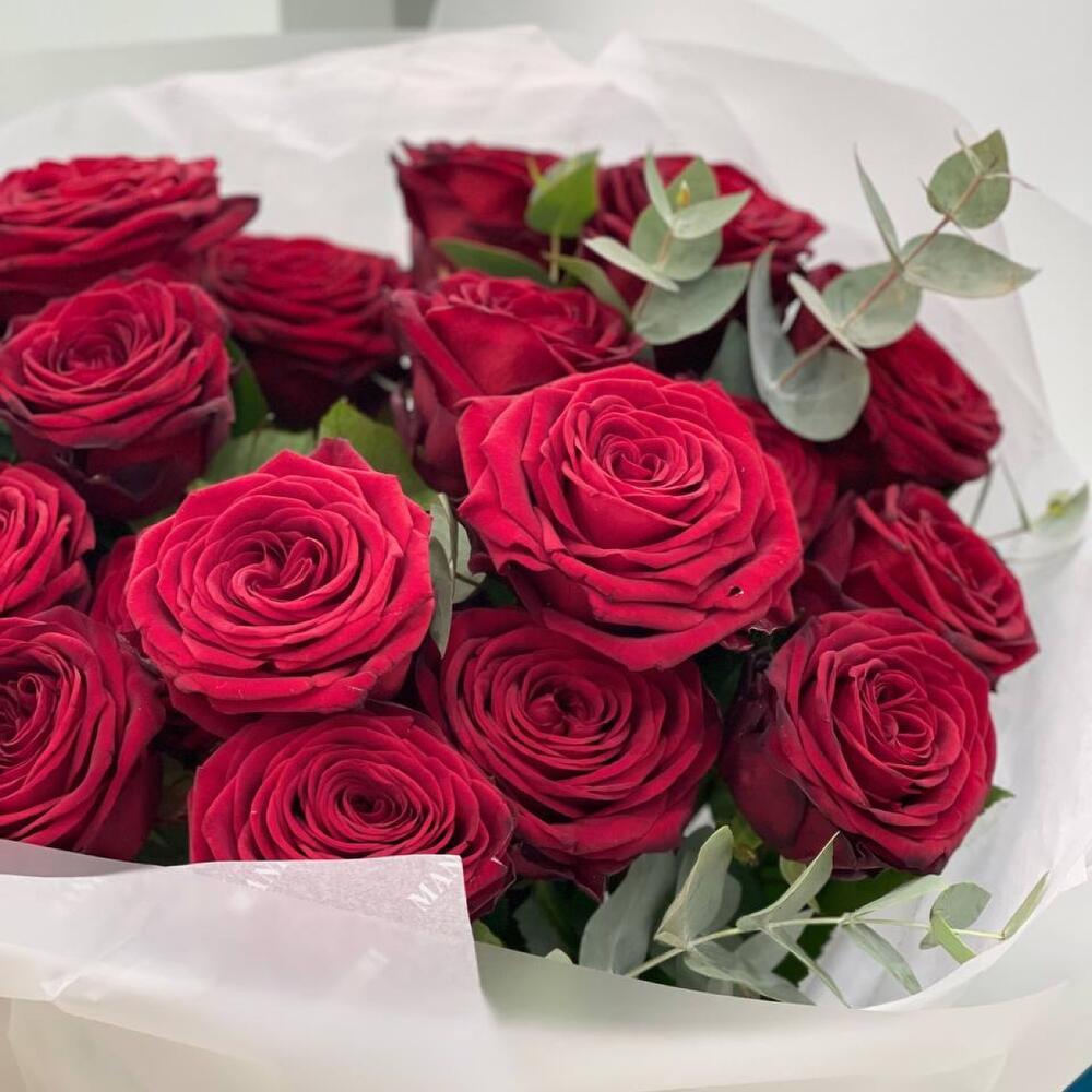 Роза красная Эквадор – 21 шт.Эвкалипт – 2 шт.Подарочная упаковка – 1 шт.Средство для продления жизни цветов – 1 шт.