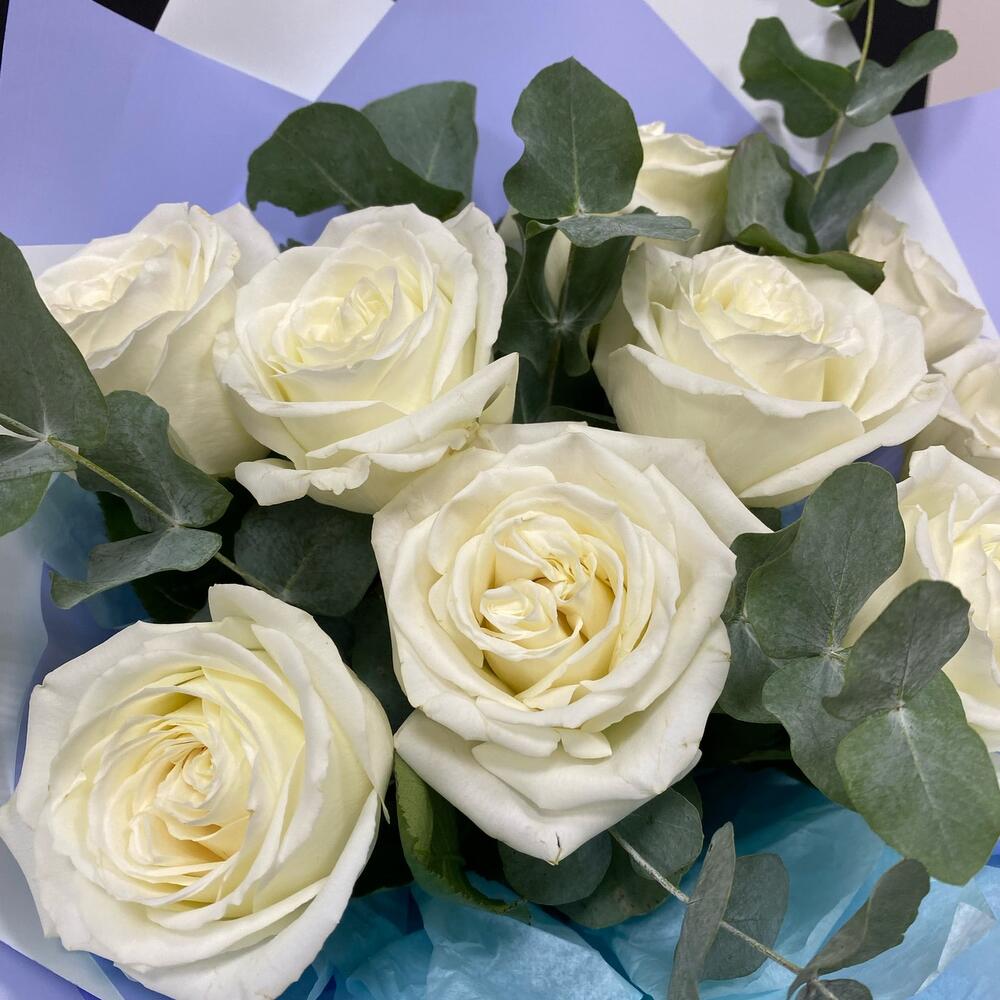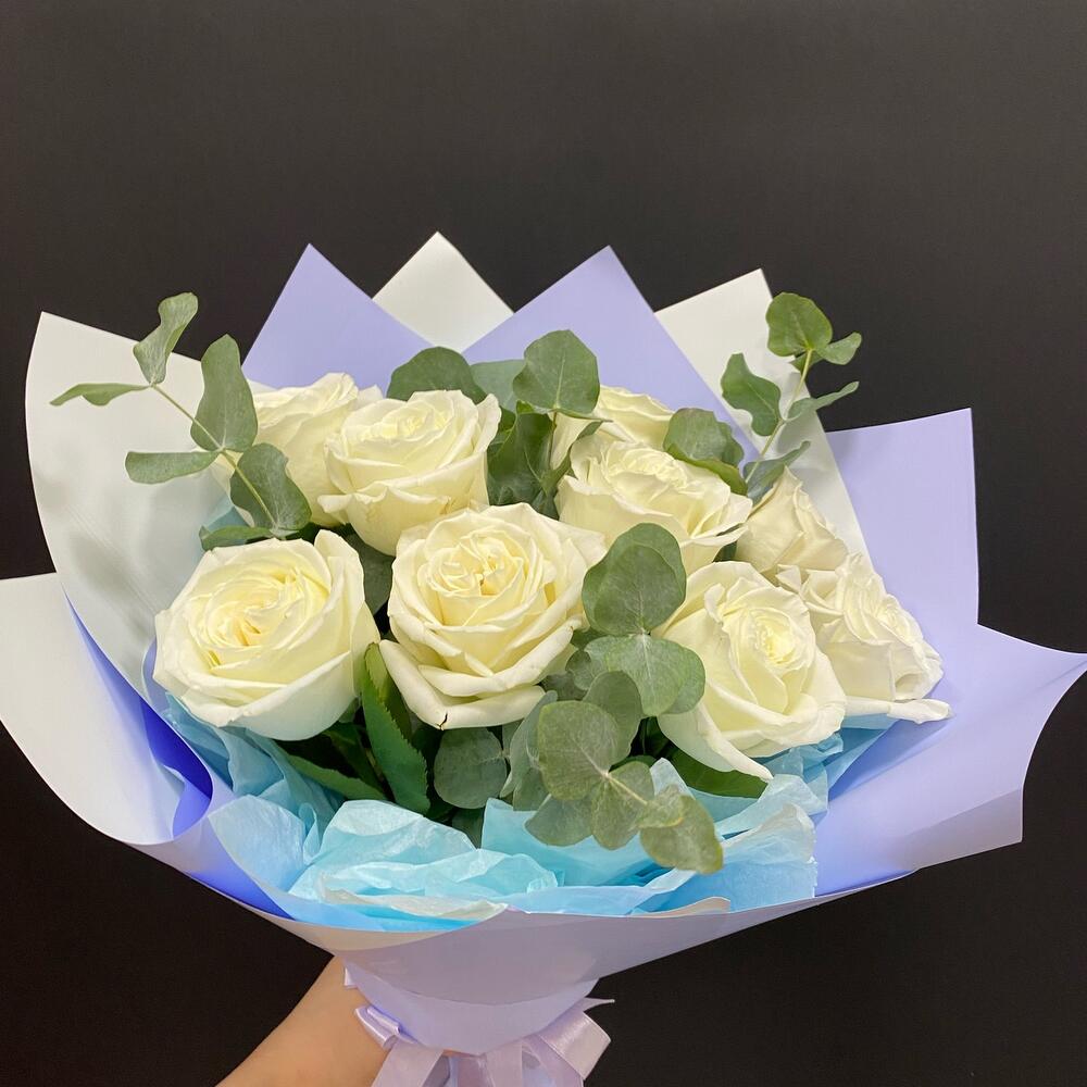 Эвкалипт – 4 шт. Лента атласная – 4 шт. Упаковка дизайнерская – 4 шт. Роза Мондиаль – 9 шт. Слюда упаковка – 2 шт.