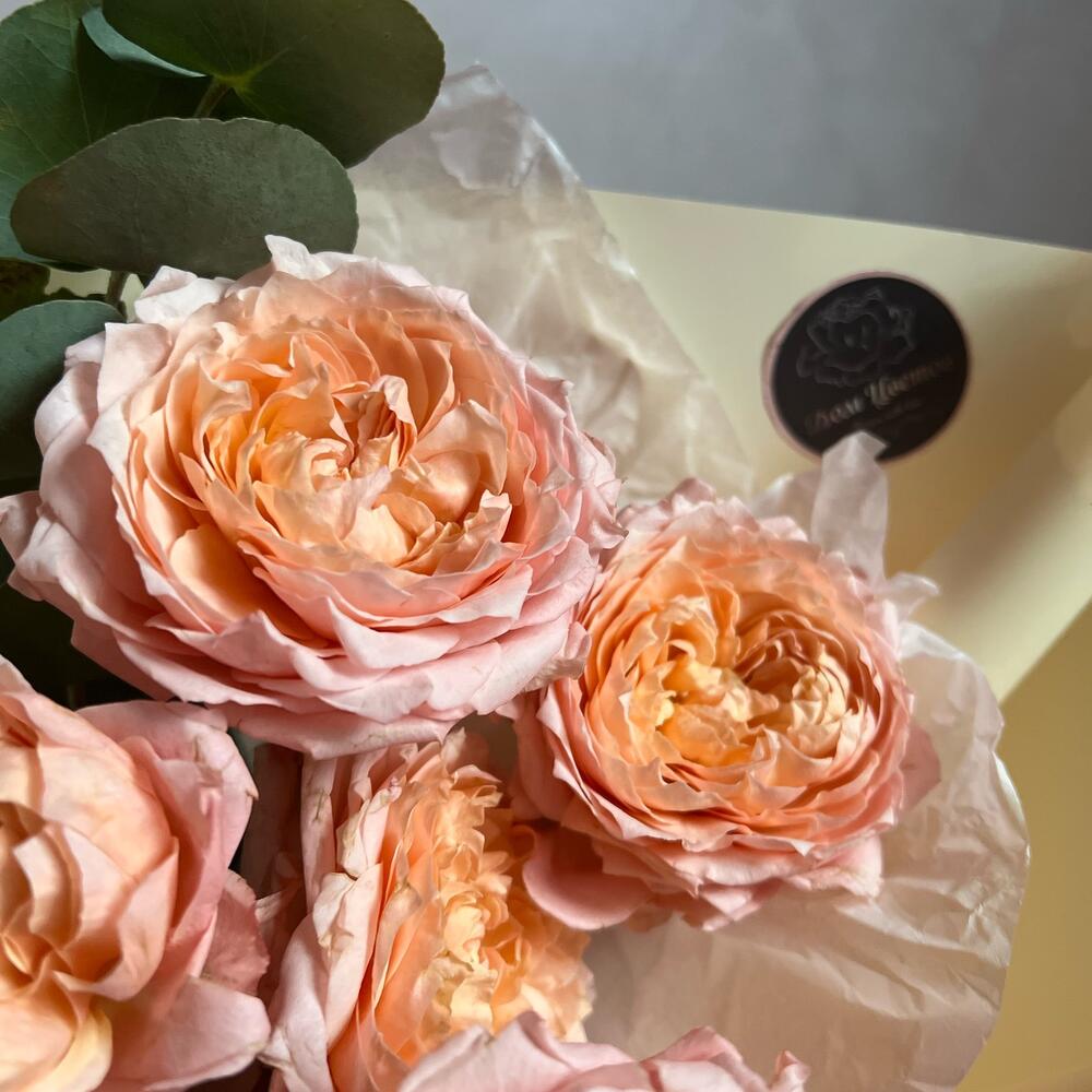 11 персиковых кустовых роз с эвкалиптом