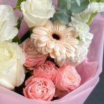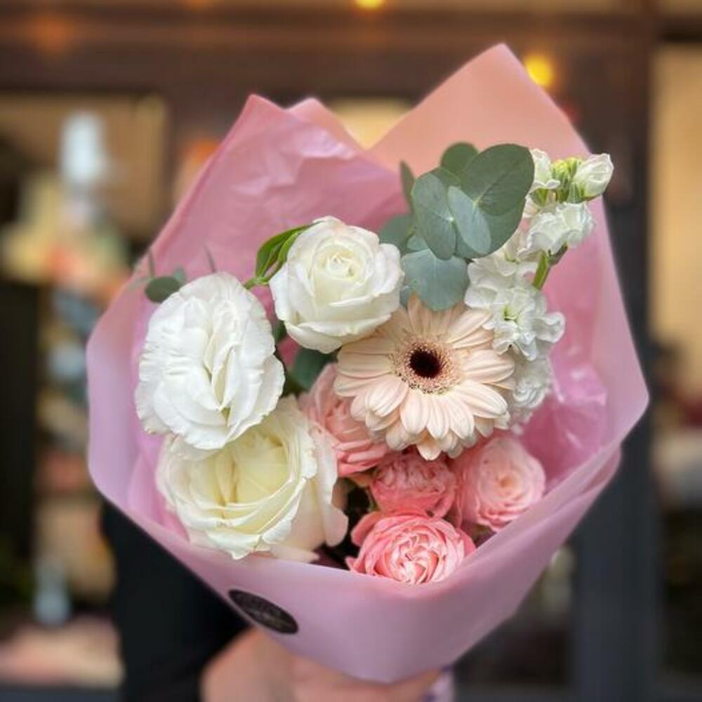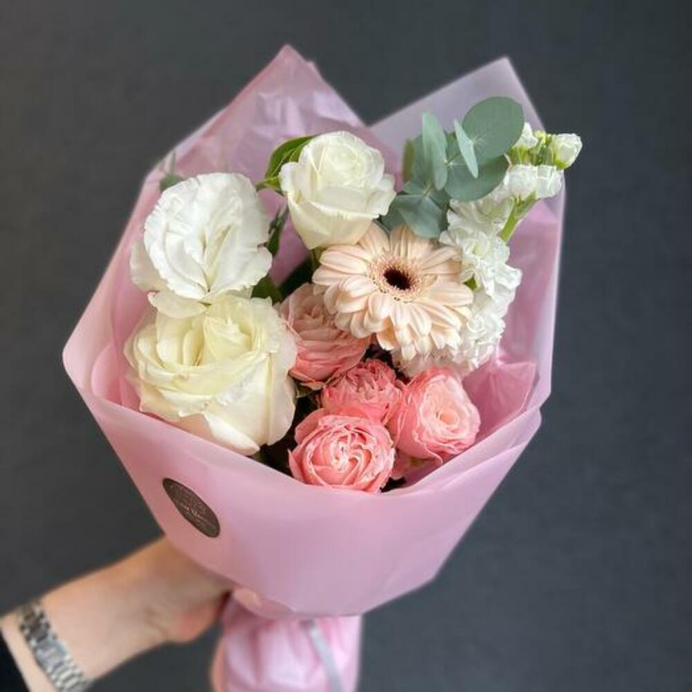 Гербера – 1 шт.Кустовая пионовидная роза – 1 шт.Одноголовая роза – 1 шт.Маттиола – 1 шт.Лизиантус – 1 шт.Эвкалипт – 1 шт.декоративная упаковка – 1 шт.Атласная лента – 1 шт.