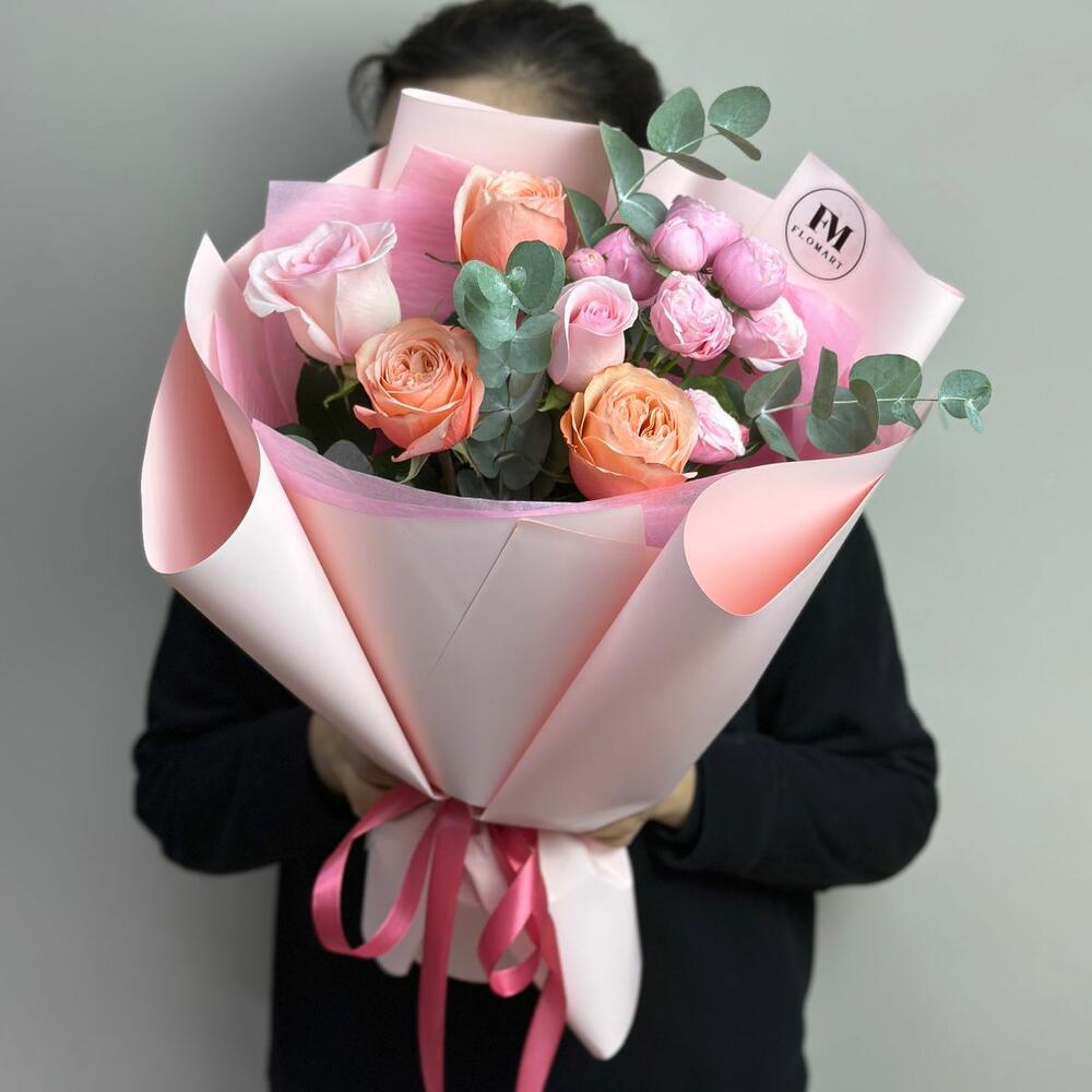 Цветы в большой коробке: садовые розы, лизиантус, маттиола, тюльпаны