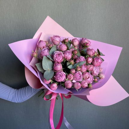Эвкалипт – 2 шт. Роза одноголовая – 3 шт. Упаковка – 1 шт. Лента атласная – 1 шт. Диантус – 3 шт. роза кустовая (веток) – 3 шт.