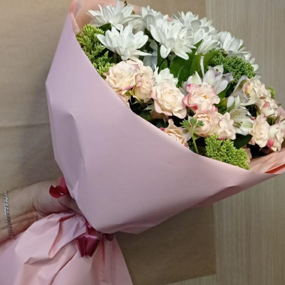 Роза кустовая – 3 шт. Хризантема кустовая – 2 шт. Альстромерия Микс Европа – 1 шт.