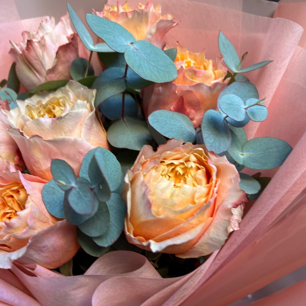 Роза садовая – 7 шт.Эвкалипт – 3 шт.Упаковка дизайнерская – 2 шт.Лента атласная – 1 шт.