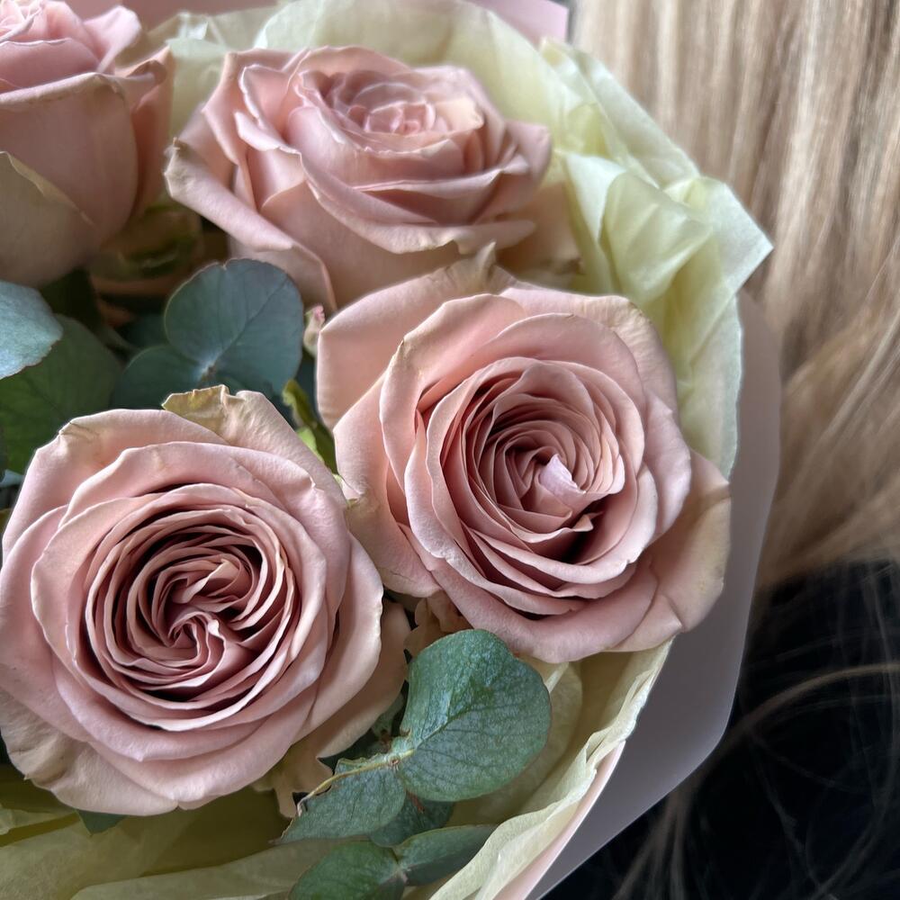 Эвкалипт – 2 шт.Лента атласная – 1 шт.Роза пионовидная – 5 шт.Дизайнерская упаковка – 1 шт.