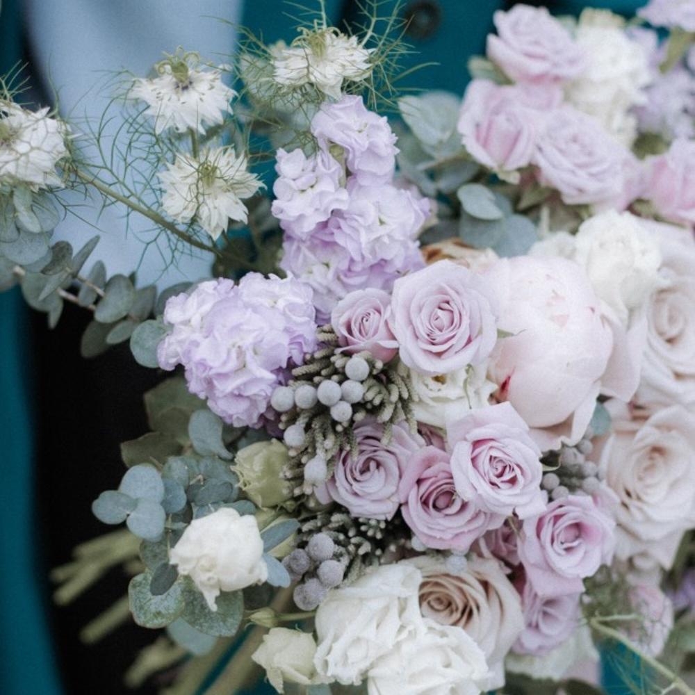 Маттиола – 6 шт.Роза кустовая – 6 шт.Мента – 6 шт.Лизиантус Алиса белый – 5 шт.Бруния – 6 шт.Эвкалипт Микс – 8 шт.Пион – 3 шт.Нигелла – 5 шт.Лента атласная – 3 шт.