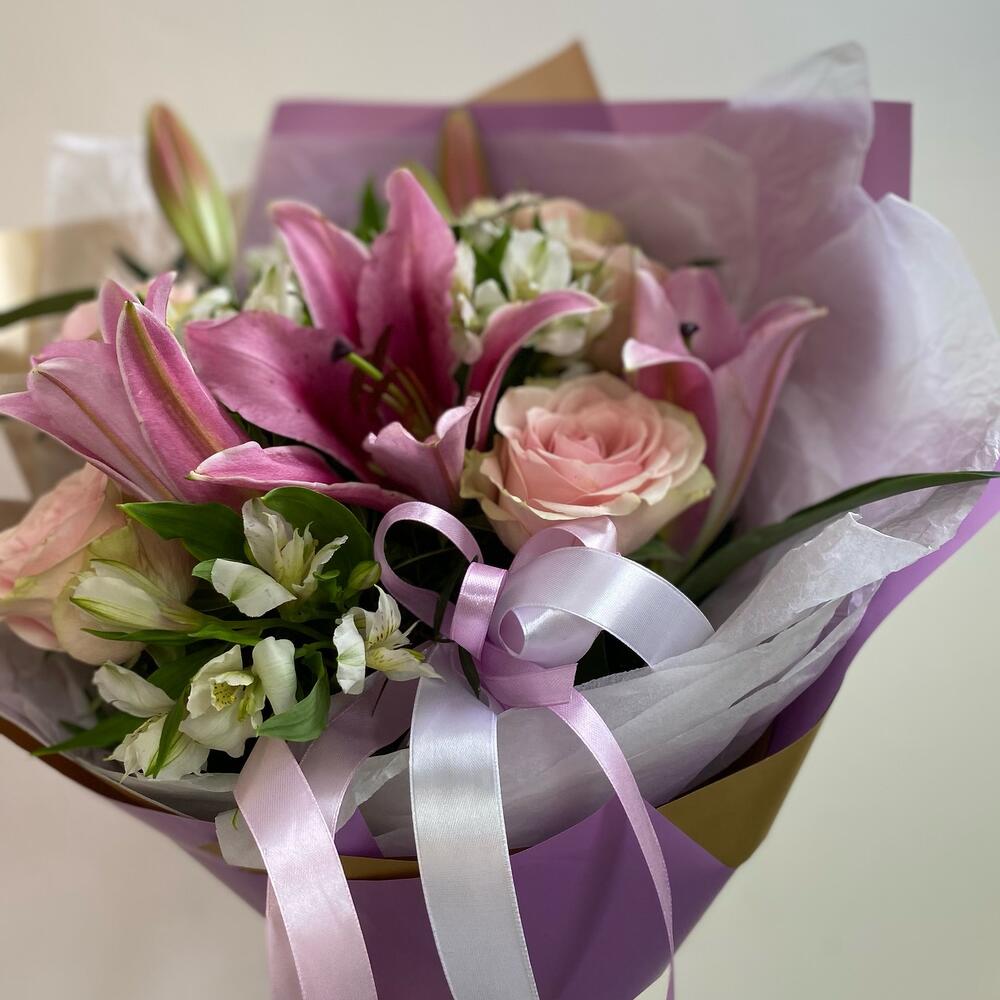 Альстромерия – 5 шт.Роза – 5 шт.Упаковка – 5 шт.Тишью белое – 6 шт.фисташка зелень – 9 шт.ленты атласные – 8 шт.лилия ароматная ветка – 2 шт.