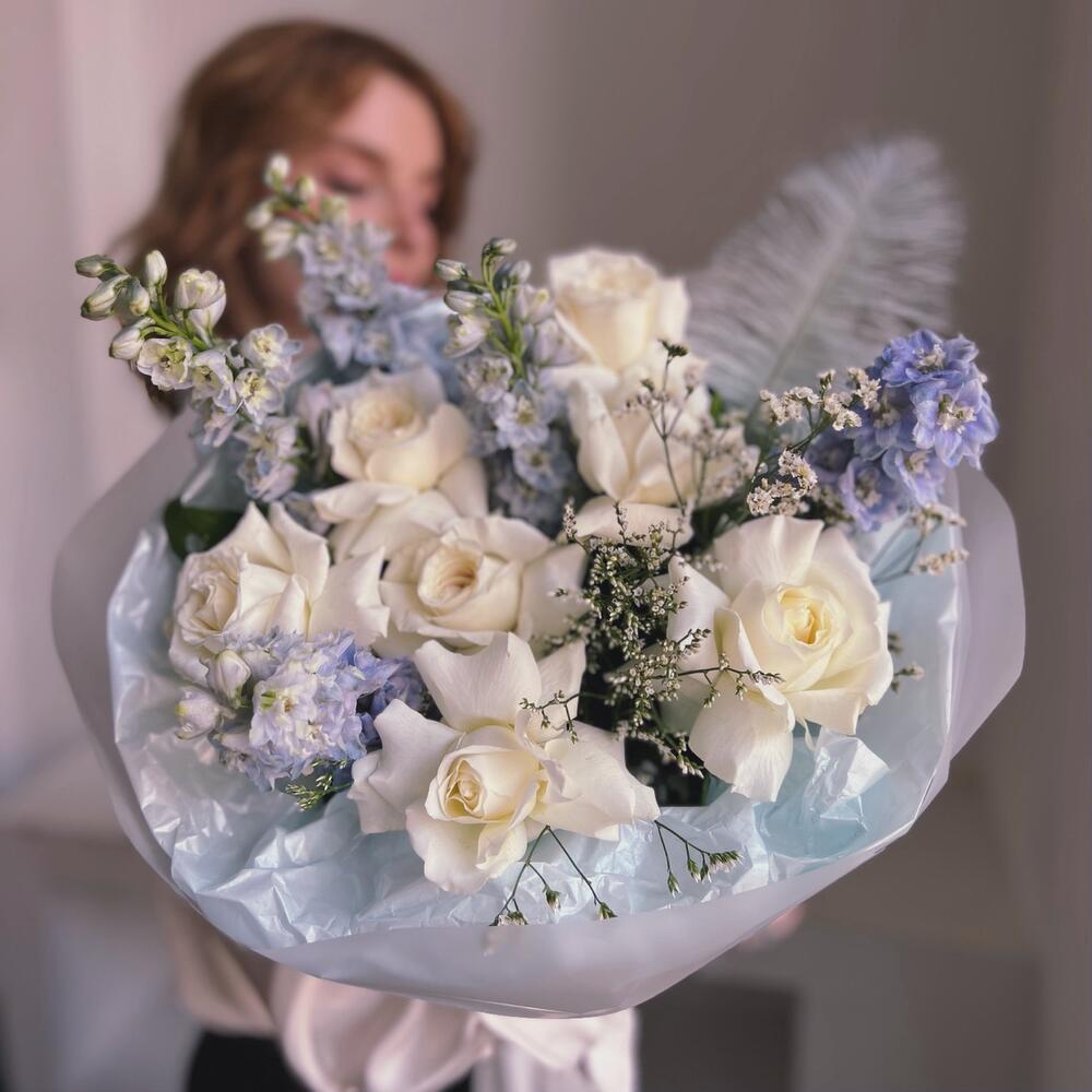 Дельфиниум – 5 шт.Лимониум – 3 шт.Упаковка дизайнерская – 1 шт.Французская роза – 7 шт.перо декоративное – 1 шт.