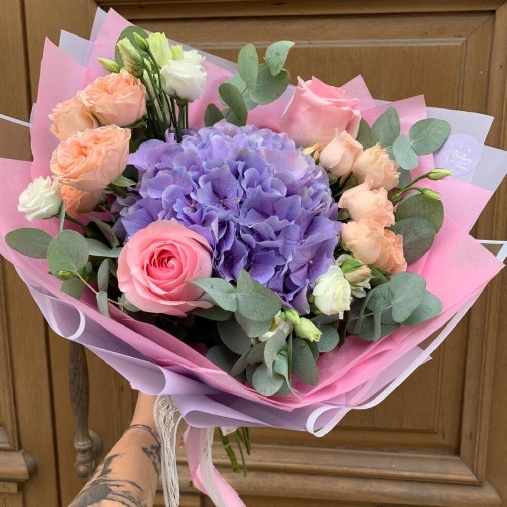 Гортензия сиреневая – 1 шт.Роза розовая – 2 шт.Роза кустовая – 2 шт.Лизиантус – 1 шт.Эвкалипт – 1 шт.Дизайнерская упаковка – 1 шт.октрыточка с вашими пожеланиями – 1 шт.Шоколадка – 1 шт.