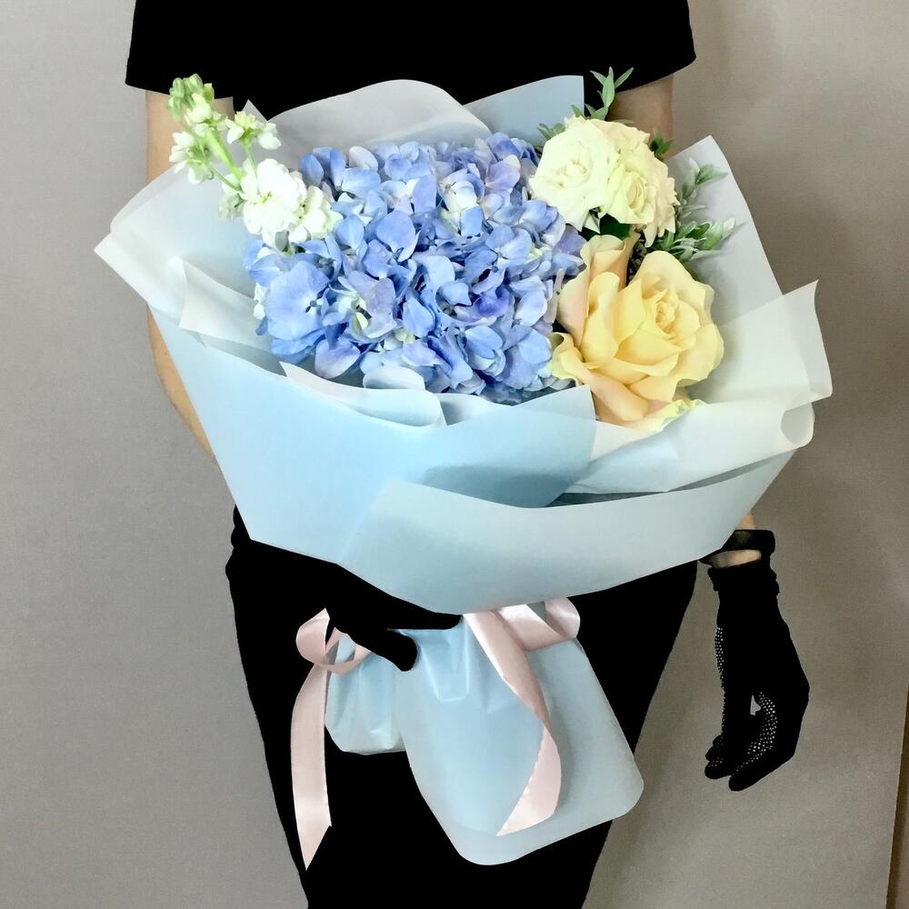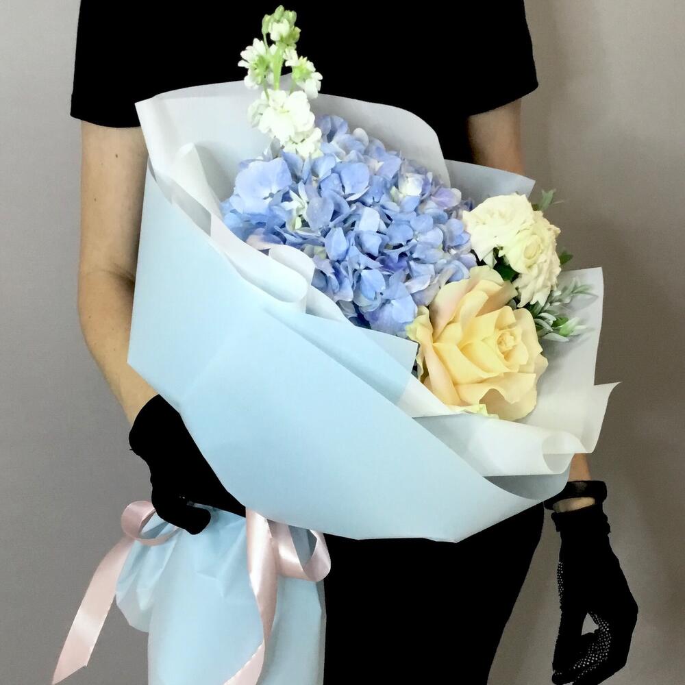 Маттиола – 1 шт.Кустовая роза – 1 шт.Лента атласная – 1 шт.Фисташка – 2 шт.Гортензия голубая – 1 шт.роза шарман – 1 шт.