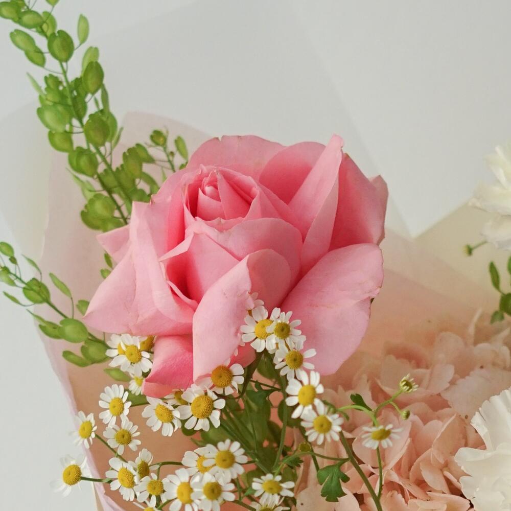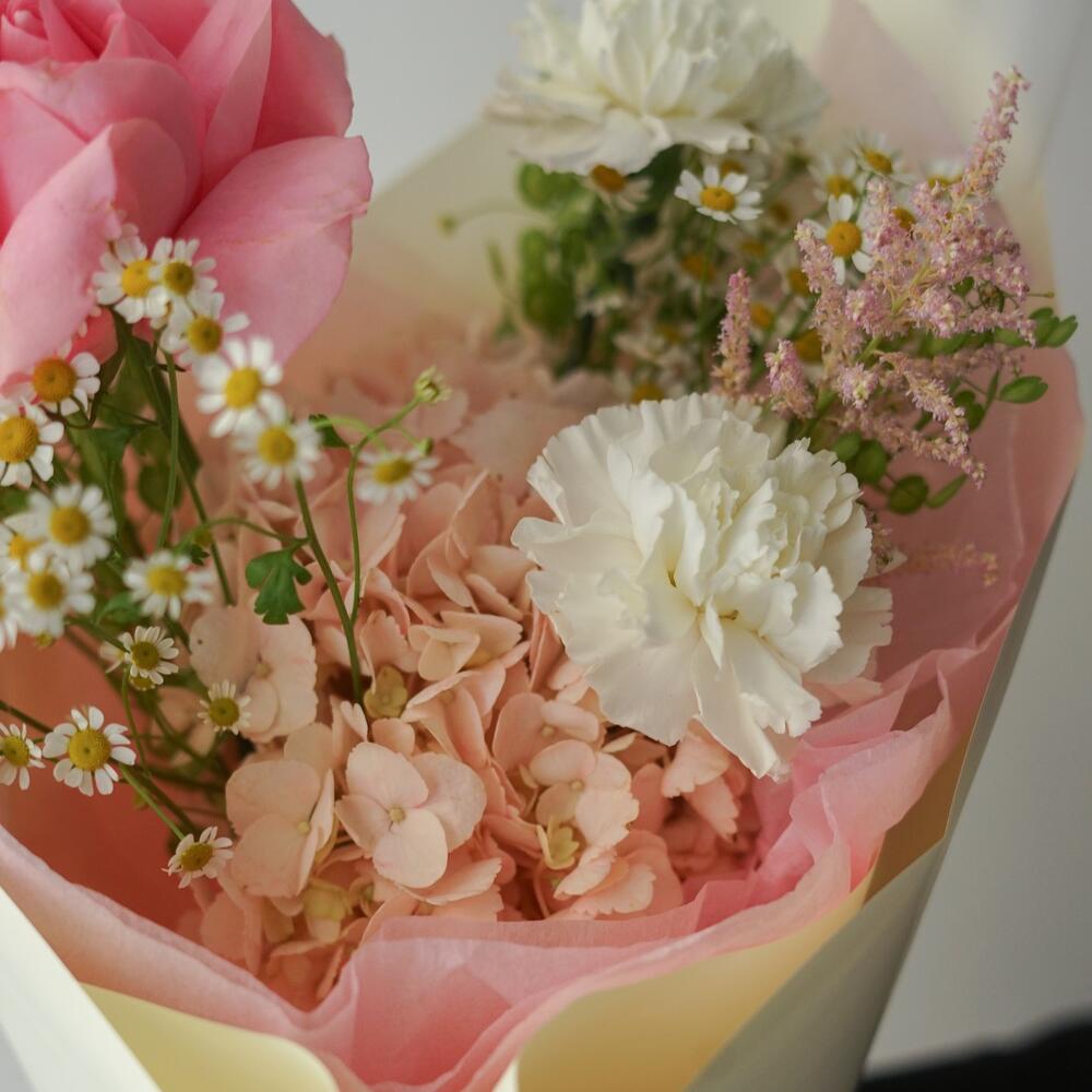 Гортензия – 1 шт.Матрикария – 2 шт.Астильба – 1 шт.Диантус – 2 шт.Гринбелл – 4 шт.Роза французская – 1 шт.Упаковка дизайнерская – 1 шт.