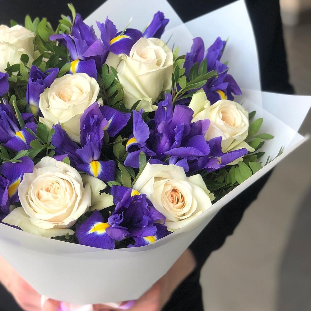 Ирис – 14 шт.Роза – 7 шт.Зелень – 6 шт.Лента атласная – 2 шт.Упаковка дизайнерская – 3 шт.