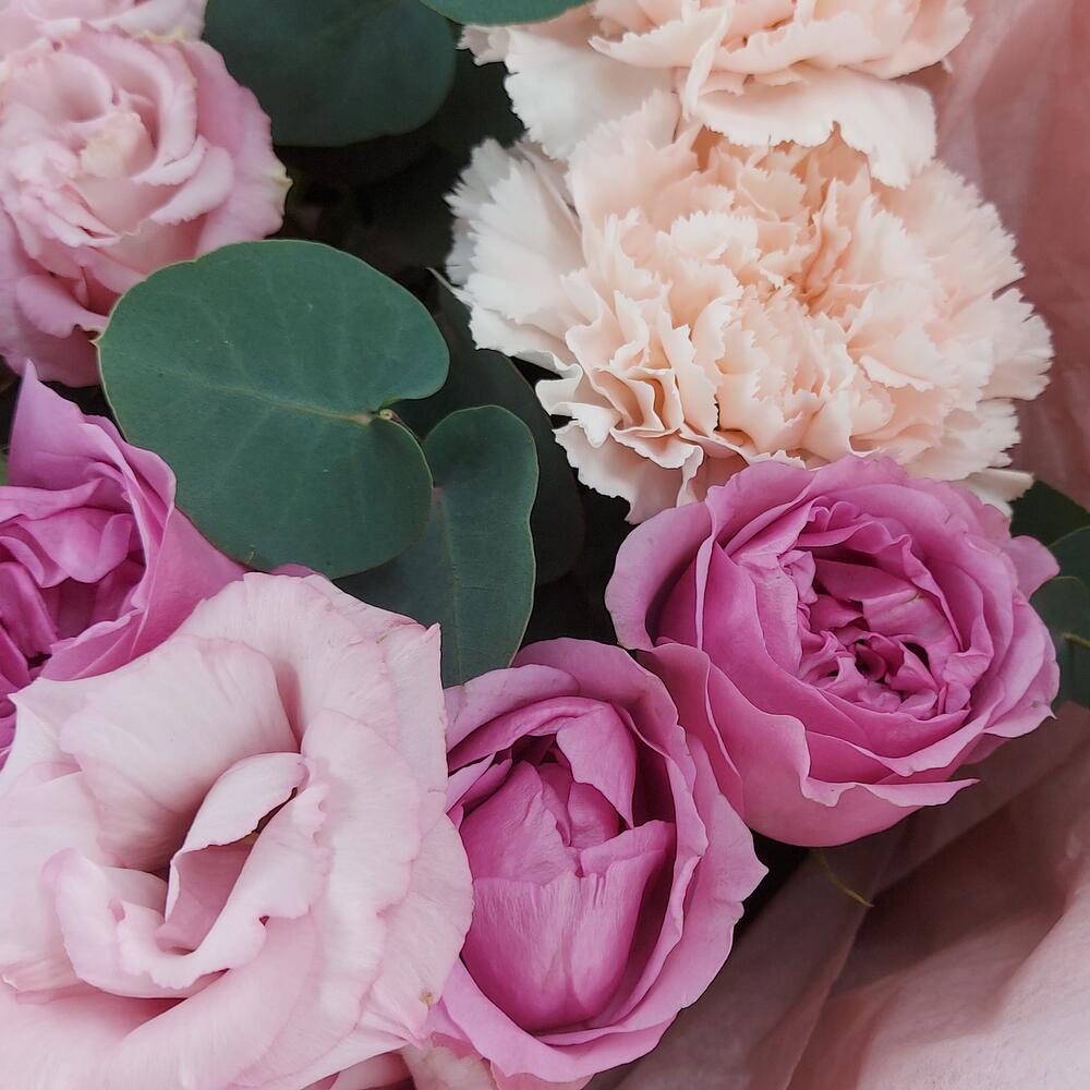 Эвкалипт – 4 шт.Эустома – 2 шт.Роза кустовая пионовидная – 2 шт.Упаковка дизайнерская – 1 шт.Пистация – 4 шт.гвоздика сортовая (диантус) – 5 шт.