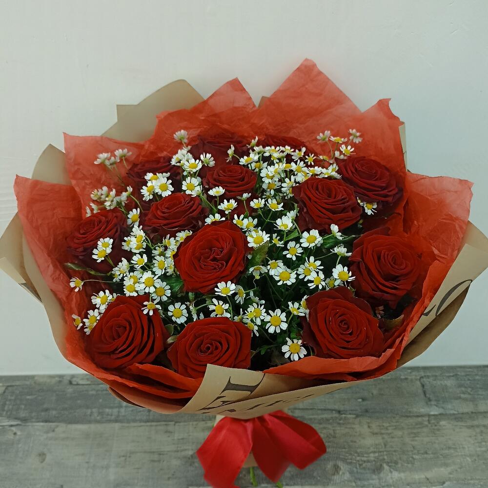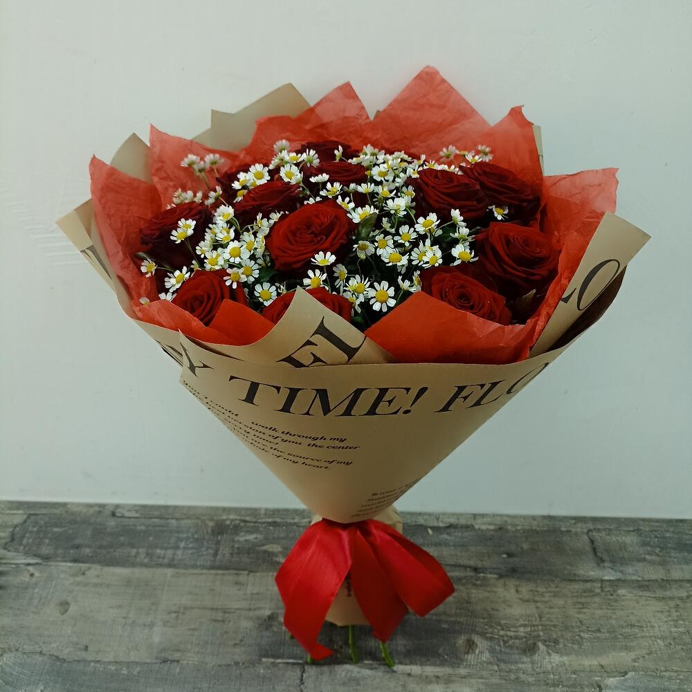 Тишью – 3 шт.Матрикария – 5 шт.Крафт – 5 шт.Роза россия красная 60 см – 13 шт.