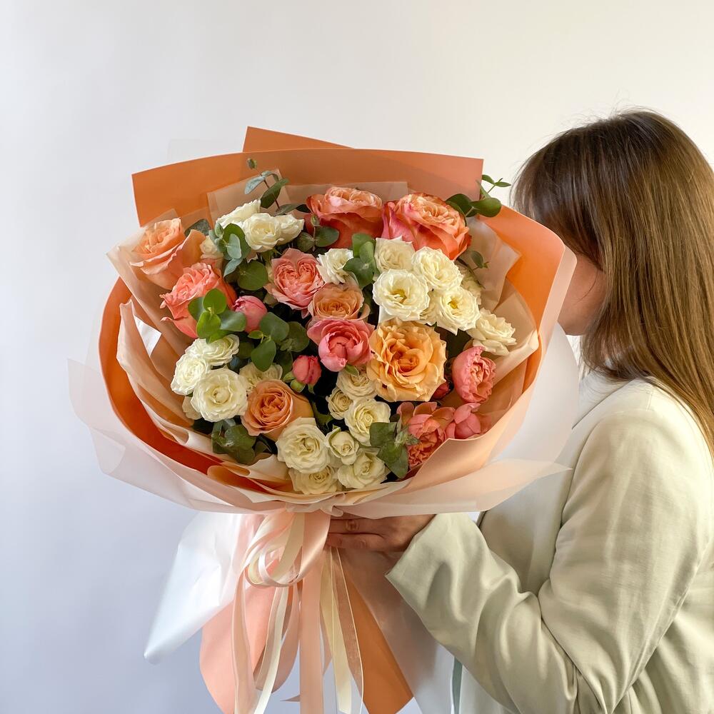 Лента – 2 шт.Роза кустовая – 4 шт.Эвкалипт – 3 шт.Роза одноголовая – 7 шт.Роза кустовая пионовидная – 3 шт.Упаковка дизайнерская – 3 шт.